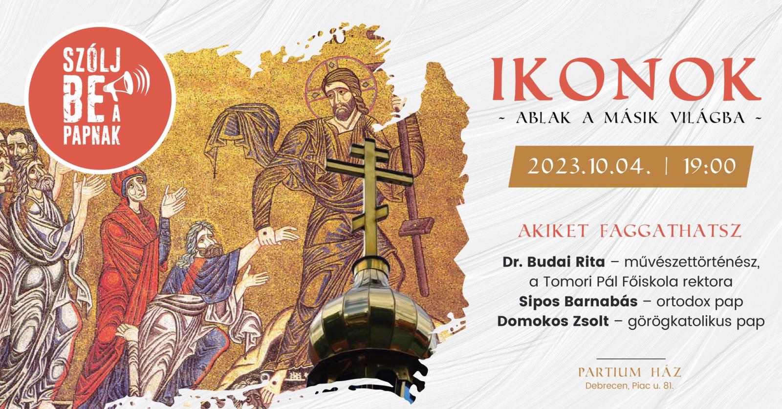 Mit jelent a „festett teológia” kifejezés, amelyet az ikonokra használnak? Miért került sor az ikonrombolásra az egyháztörténelemben? Mitől különlegesek az ortodox ikonok, hogyan nyitnak ablakot egy másik világba? Hogyan működik Debrecenben a 20. jubileumát ünneplő ortodox közösség? Várunk mindenkit, akik érdeklődnek az ortodox hitgyakorlás, az ikonok világa iránt. Kérdezésre ezúttal is lehetőség lesz, a kérdezőket egy pohár borral jutalmazzuk.