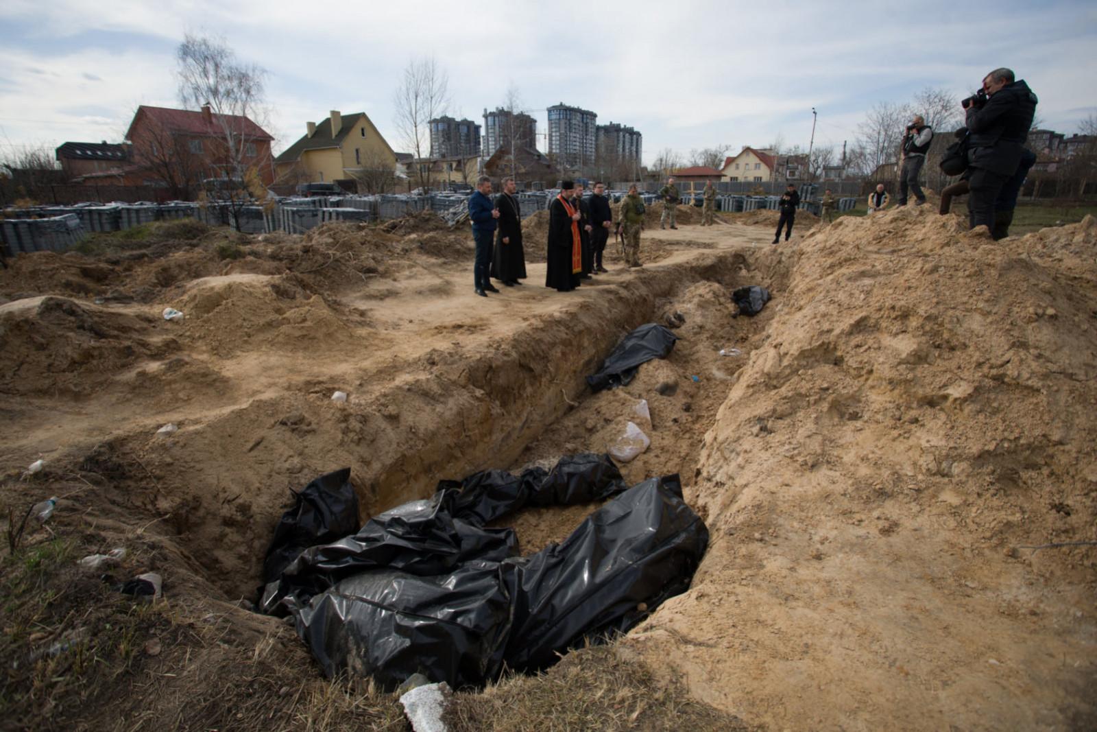 Miután felszabadították a városokat az orosz megszállás alól, megkínzott civilek több száz holttestét és több tucat tömegsírt fedeztek fel számos Kijev környéki településen, köztük Irpinyben, Bucsában, Hosztomelben, Borogyankában és Motizsinben. Anatolij Fedoruk polgármester szerint csak Bucsában közel háromszáz embert temettek tömegsírba, több tucat holttest hevert a város romos utcáin, s néhányuknak meg is volt kötve a keze.