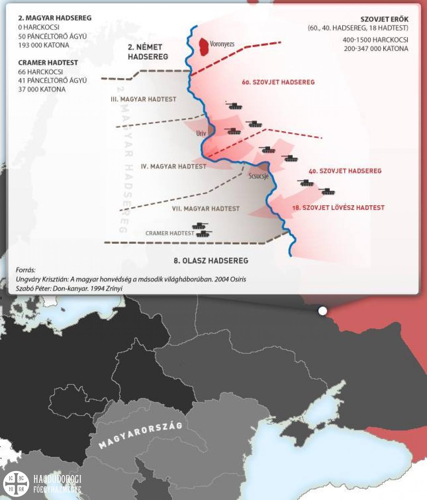 A gyéren és elégtelenül kialakított védvonalak és lövészárkok, a kemény orosz télhez alkalmatlan öltözet, a későn, vagy romlottan, penészesen megérkező élelem, a németek által zsákmányolt, majd a magyaroknak továbbadott elavult fegyverek, a nehéztüzérség nevetségesen kis száma, a körülmények miatt legyöngült honvédek állapota és a hatalmas szovjet túlerő borzalmas tragédiát vetített előre. Január 12-én, a Don kanyarulatánál a folyó fölhizlalt jegén a szovjet csapatok áttörtek, és kezdetét vette az addig is több tízezres veszteséget elkönyvelő II. magyar hadsereg tragédiája. A folyón túl állomásozó és azon átkelő szovjet csapatokat a dombon túl állomásozó magyar hadtest nem láthatta, így teljesen váratlanul érte őket a rettenetes erejű támadás. Az ezt követő napokban, hetekben tízezrével estek el katonáink és munkaszolgálatosaink, akiknek hősies helytállása ellenére a végén nem maradt más, mint a menekülés.