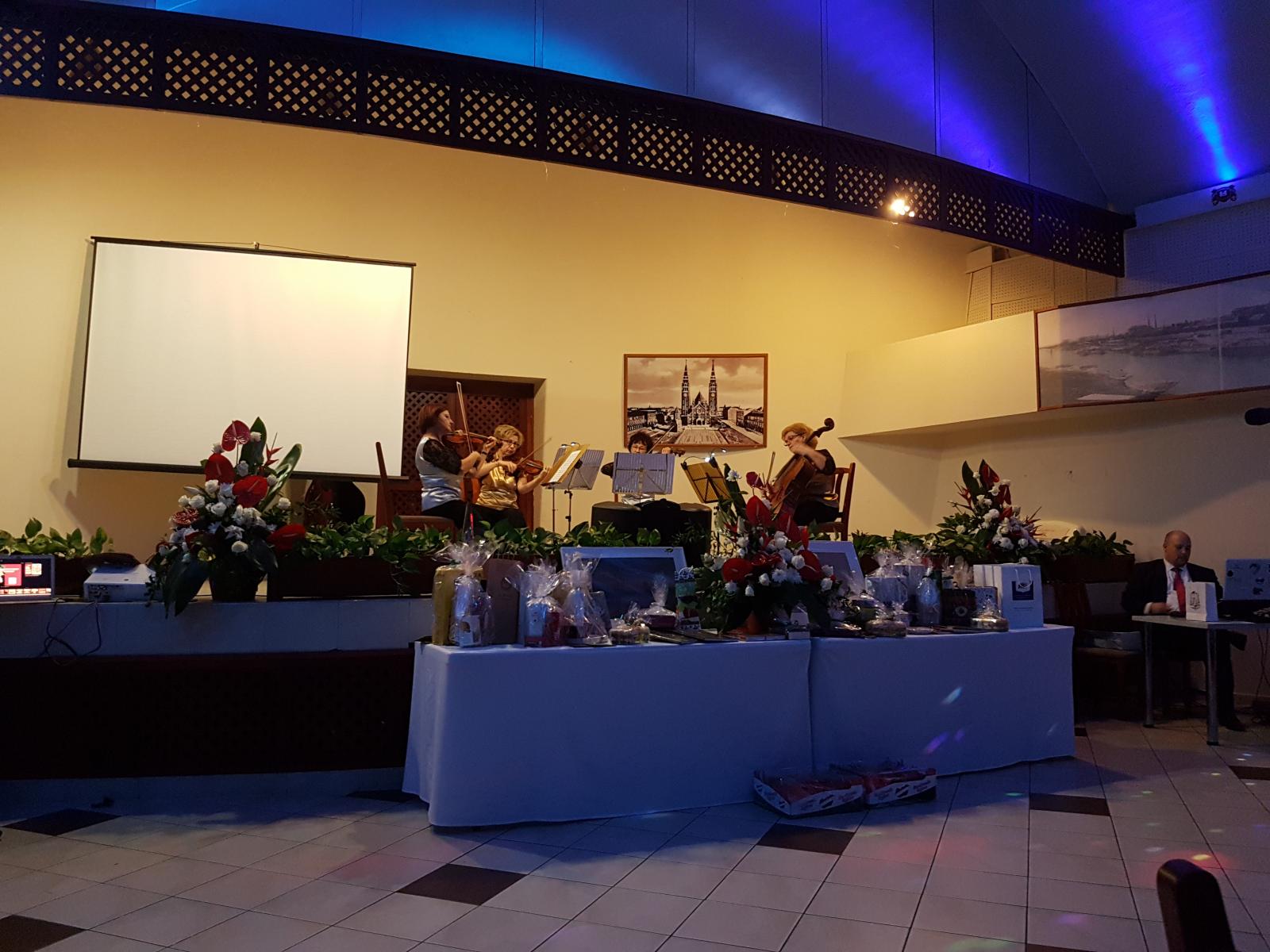 A mintegy száz fős együtt ünneplő vendégsereg két fellépőt hallgatott a bálon, a Windsingers acapella együttest, akik az utóbbi években jelentős hazai és nemzetközi sikereket értek el, és az AranyEzüst Quartett-et, a Szegedi Szimfonikus Zenekar művészeinek vonósnégyesét. Mindkét előadás rendkívül színvonalas és szórakozató volt, és kiemelendő, hogy mindkét társulat a műsorával támogatta az alapítványt. Ezúton is még egyszer köszönjük nekik! Az előadások után következett az este csúcspontja, az alapítvány most alapított díjának átadása, melyet a szegedi görögkatolikusokért végzett munkájáért fogja kapni minden évben egy ember.