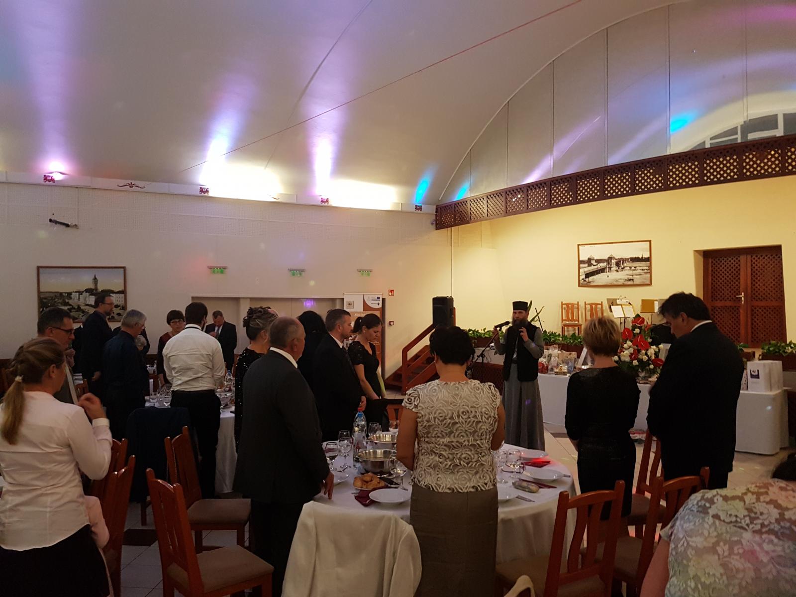 Ezen jeles események megünneplése végett az elmúlt hétvégén vendégünk volt Kocsis Fülöp érsek-metropolita atya, aki szombat délután érkezett. Az ő vezetésével vecsernye elimádkozásával kezdtük meg az ünneplést. Már itt is szép számmal gyűltünk össze, és sikerült meghitt hangulattal megtölteni templomunkat. Ezek után gyorsan összeszedtük magunkat, és átmentünk a pár száz méterre található Vármegye étterembe, ahol 13. alkalommel rendeztünk alapítványi, jótékonysági bált. Ezen bálok bevétele mindig egy előre meghatározott konkrét cél. A mostani bál bevételét a parókia udvarának felújítására szeretnénk fordítani. De mint már fentebb említettem, ezen a bálon más, fontosabb eseményeket is ünnepeltünk.