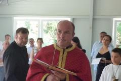 A Szentírásban megerősítést kapunk arra, hogy a vértanúk, a szentek serege, mint felhő vesz körül minket. A szentek felhője Jézus Krisztushoz vezet. „Tekintsünk tehát a hit szerzőjére és bevégzőjére, Jézusra, aki fölkínált öröm helyett a kereszt gyalázatát viselte el” - mondta a főpásztor. Majd az első augusztusi nap másik témájára, a Szent Kereszt körmenetének emlékére is utalt: „ahogyan a vízszentelés szertartásának közepén, a kereszt háromszori vízbe mártásával szentelődik meg ez a víz, ezzel a vízzel szentelődik meg közösségünk és a közösség háza, az új szolgáltató pontja is. Jézus Krisztus keresztje a gyalázat, a kivégzés eszköze volt. Számunkra az üdvösség eszközévé vált, általa megszentelődünk.”