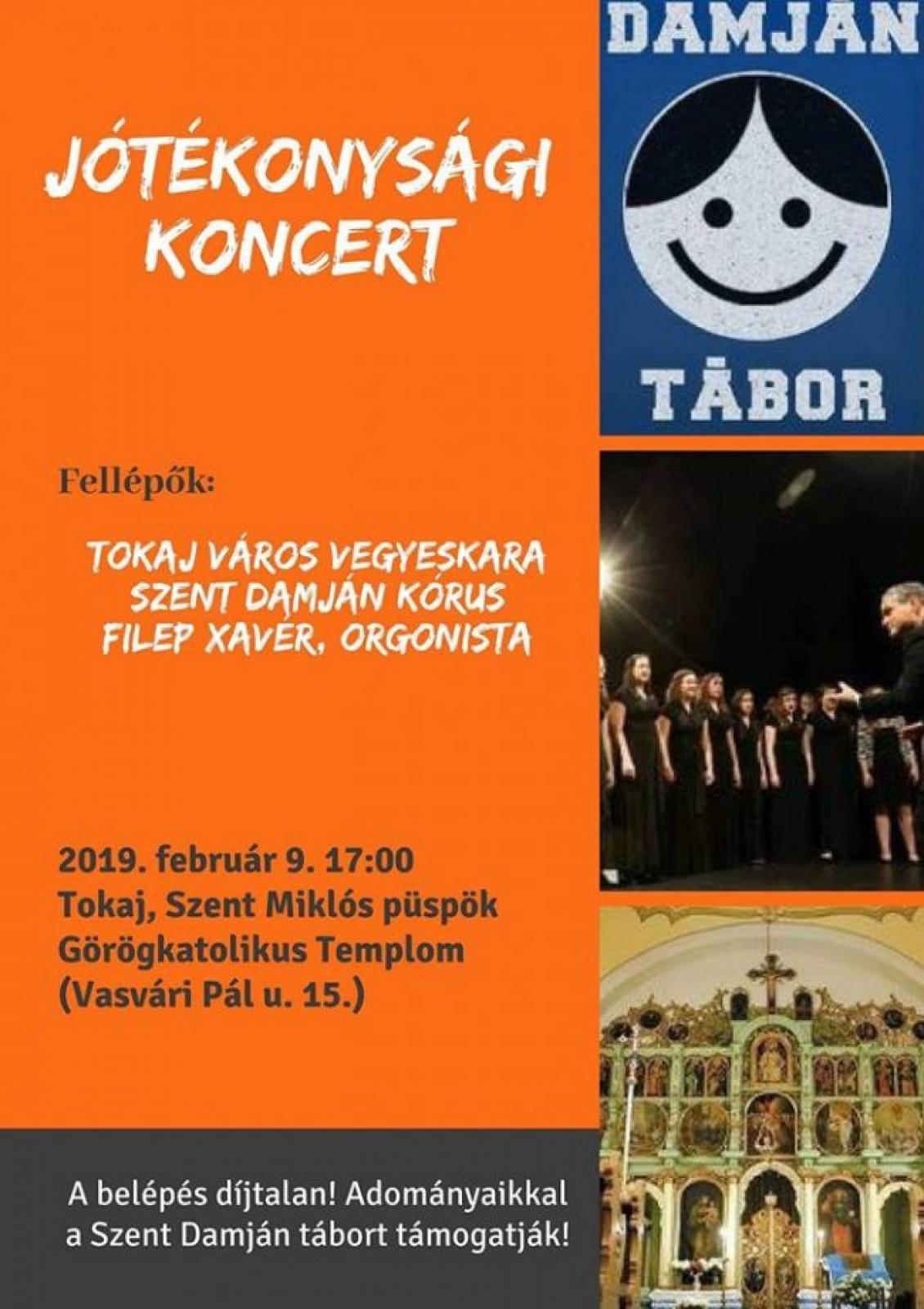 A tokaji görögkatolikus templom lesz a jótékonysági koncert helyszíne február 9-én 17.00 órától, ahová mindenkit szeretettel vár a Szent Damján Kórus, valamint a velük együtt fellépő tokaji vegyeskar és Filep Xavér orgonista. A belépés díjtalan, de aki a taps mellett pénzben is kifejezné tetszését a fellépőknek, egyúttal adakozik is, mert a bevétel a nagy népszerűségnek örvendő Szent Damján tábort, a fogyatékkal élők nyári táborát támogatja.