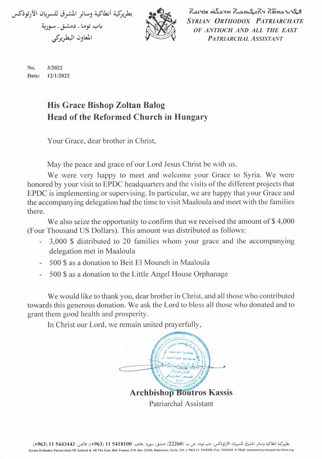 Boutros Kassis érsek levélben nyilvánított köszönetet a nagylelkű felajánlásért. Mint írja, a négyezer dollárnyi pénzadományt háromfelé osztották szét: háromezret kapott húsz maaloula-i család, ötszázat a terroristák által megkínzott édesapa, a többi pénzt pedig a Kis Angyal nevű árvaház számára adták.