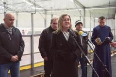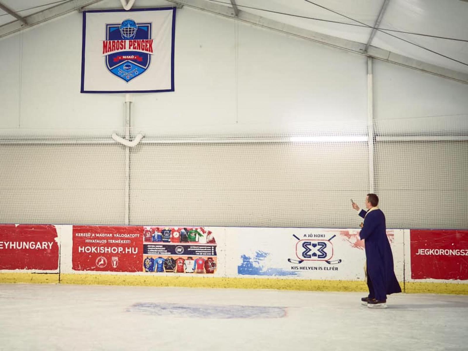 Biró István parókus atya pedig rendhagyó módon: korcsolyán állva áldott meg az új funkciókkal ellátott pályát.
