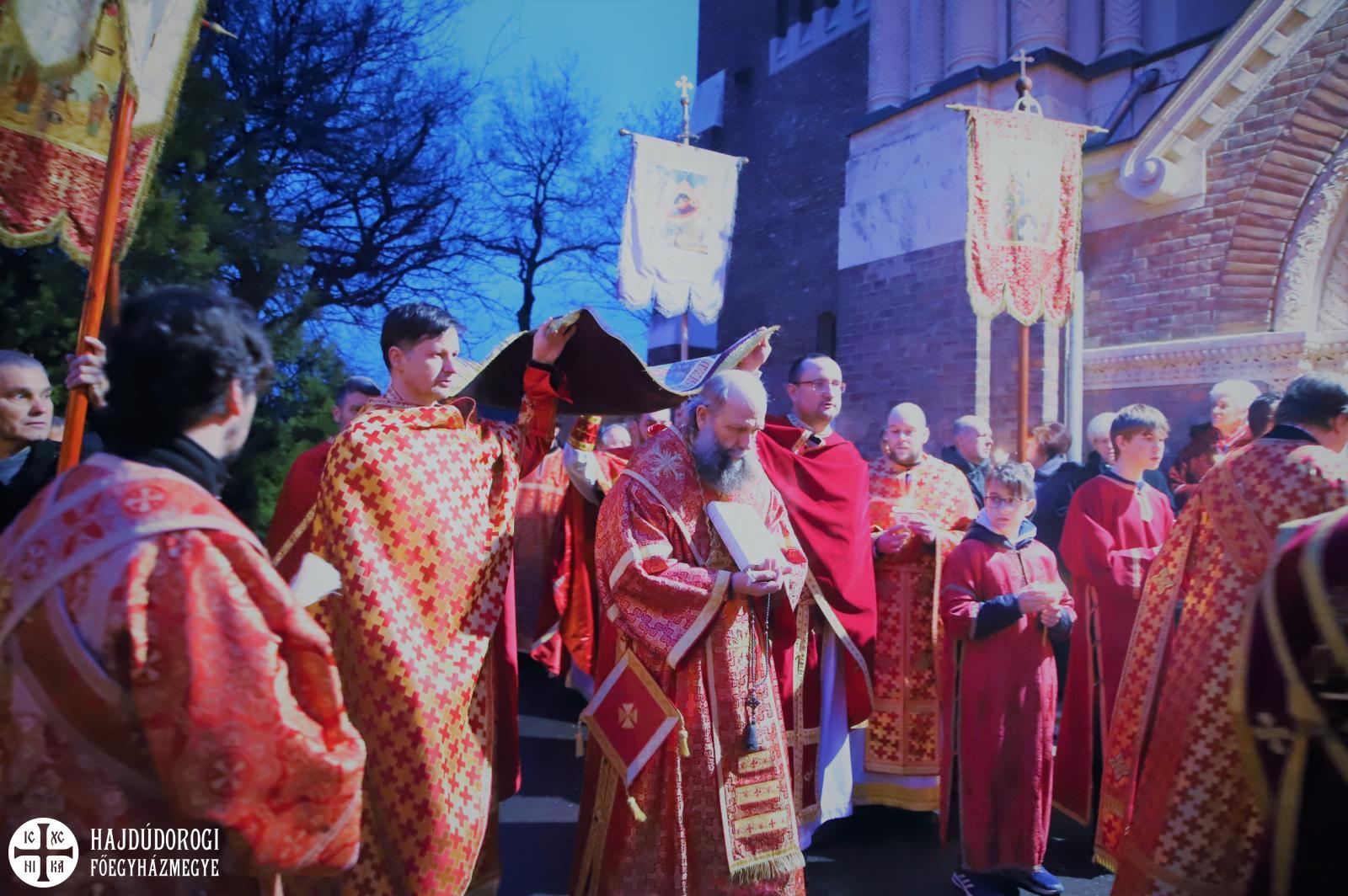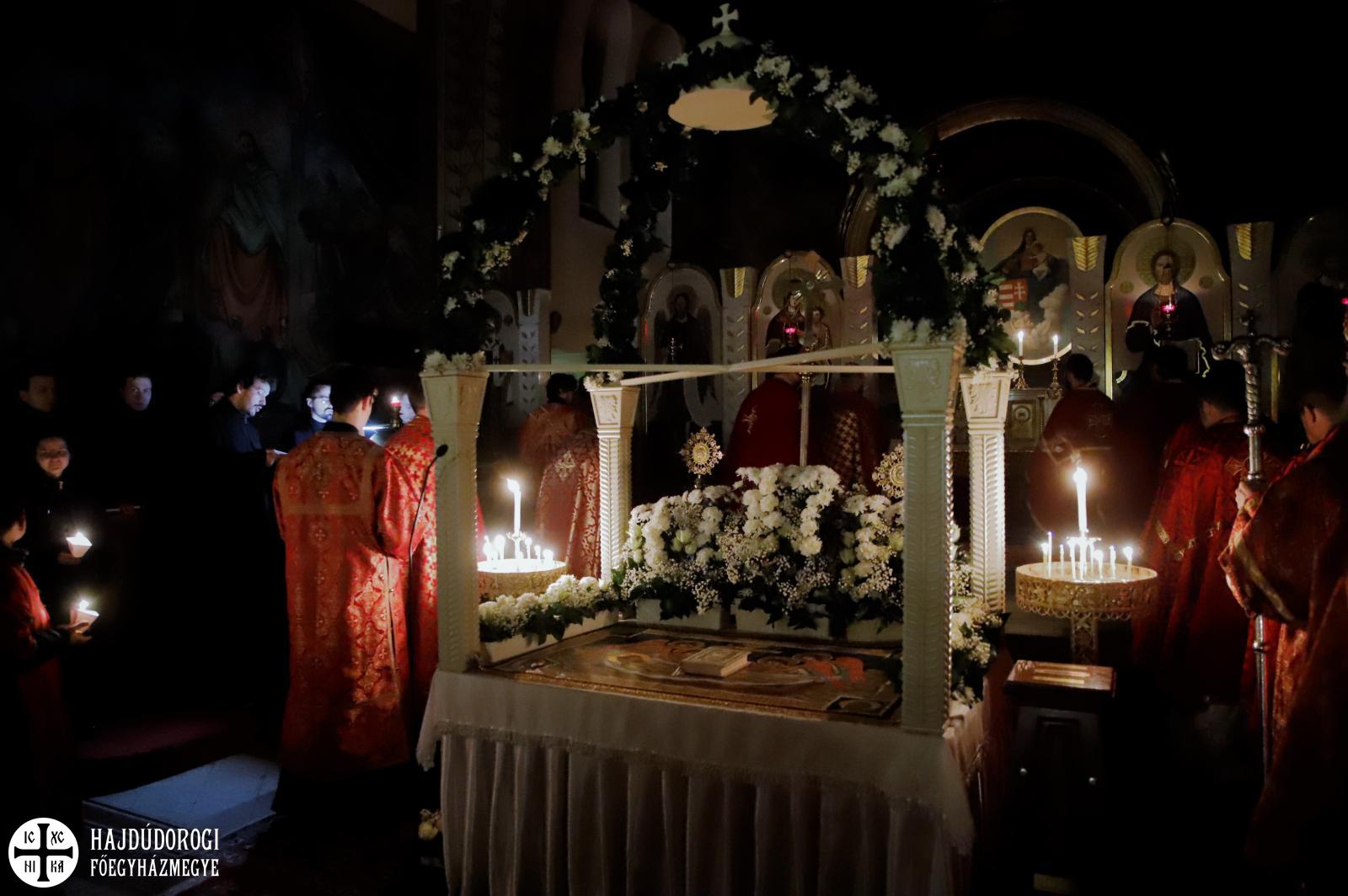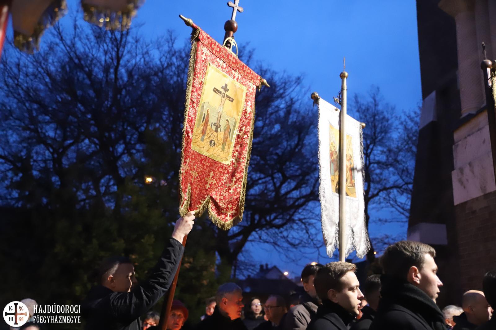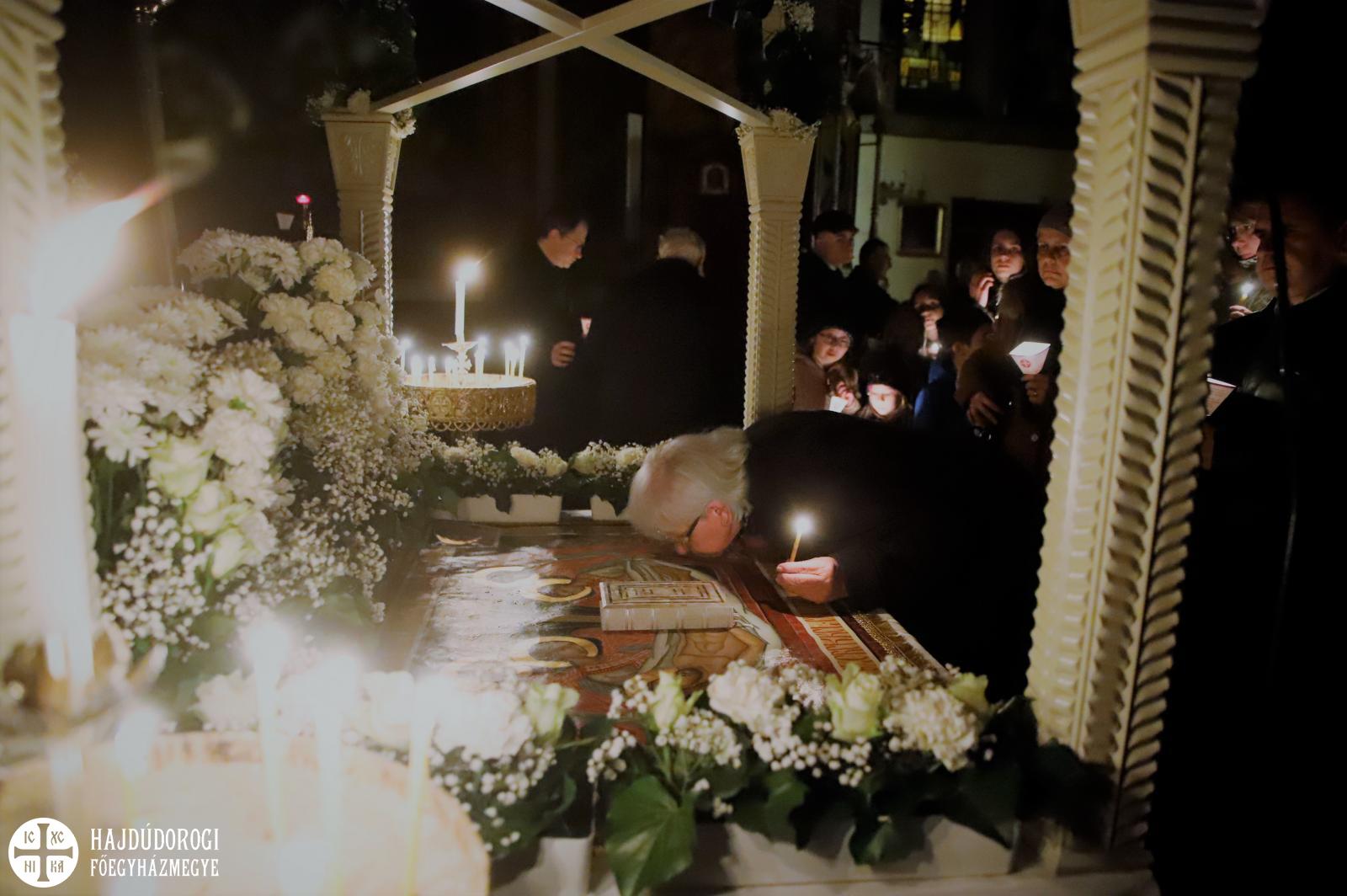 A vecsernye legszebb pillanatai voltak azok, amikor Fülöp érsek-metropolita atya háromszor megtömjénezte az oltárra terített, Krisztus testét ábrázoló sírlepelt, amit aztán a magasba emelve vittek körbe a főszékesegyház körül. A körmenet közben fennhangon énekelték a hívek a tropárt: "Az istenfélő József levevén a fáról a te legtisztább testedet, tiszta gyolcsba göngyölé és illatos szerekkel ellátva új sírba helyezé." Majd a sírlepel alatt fejet hajtva léphettek be ismét a templomba. A szertartás végén a virágokkal díszített szentsíron elhelyezték a liturgikus kendőt, amit csókkal illethettek a hívek is.