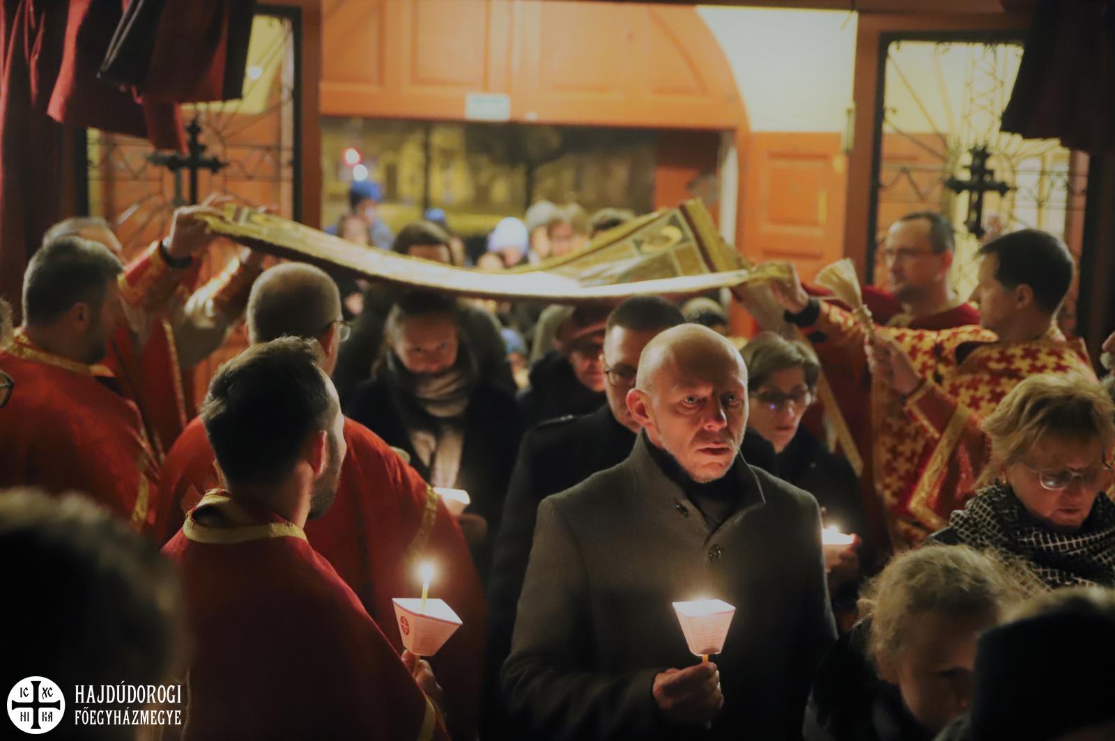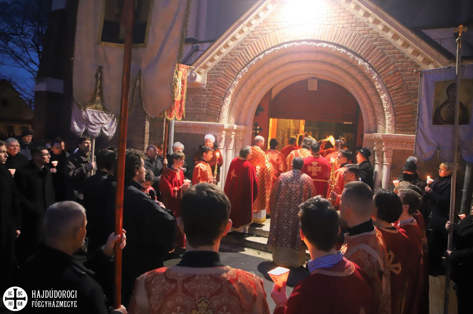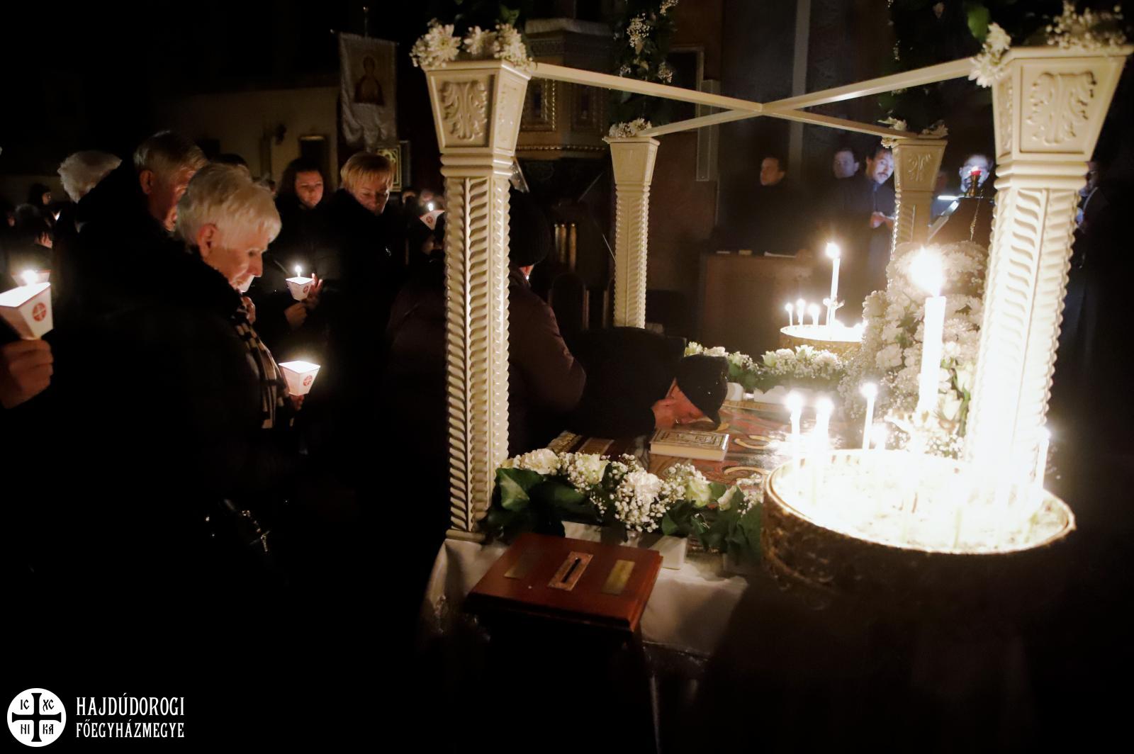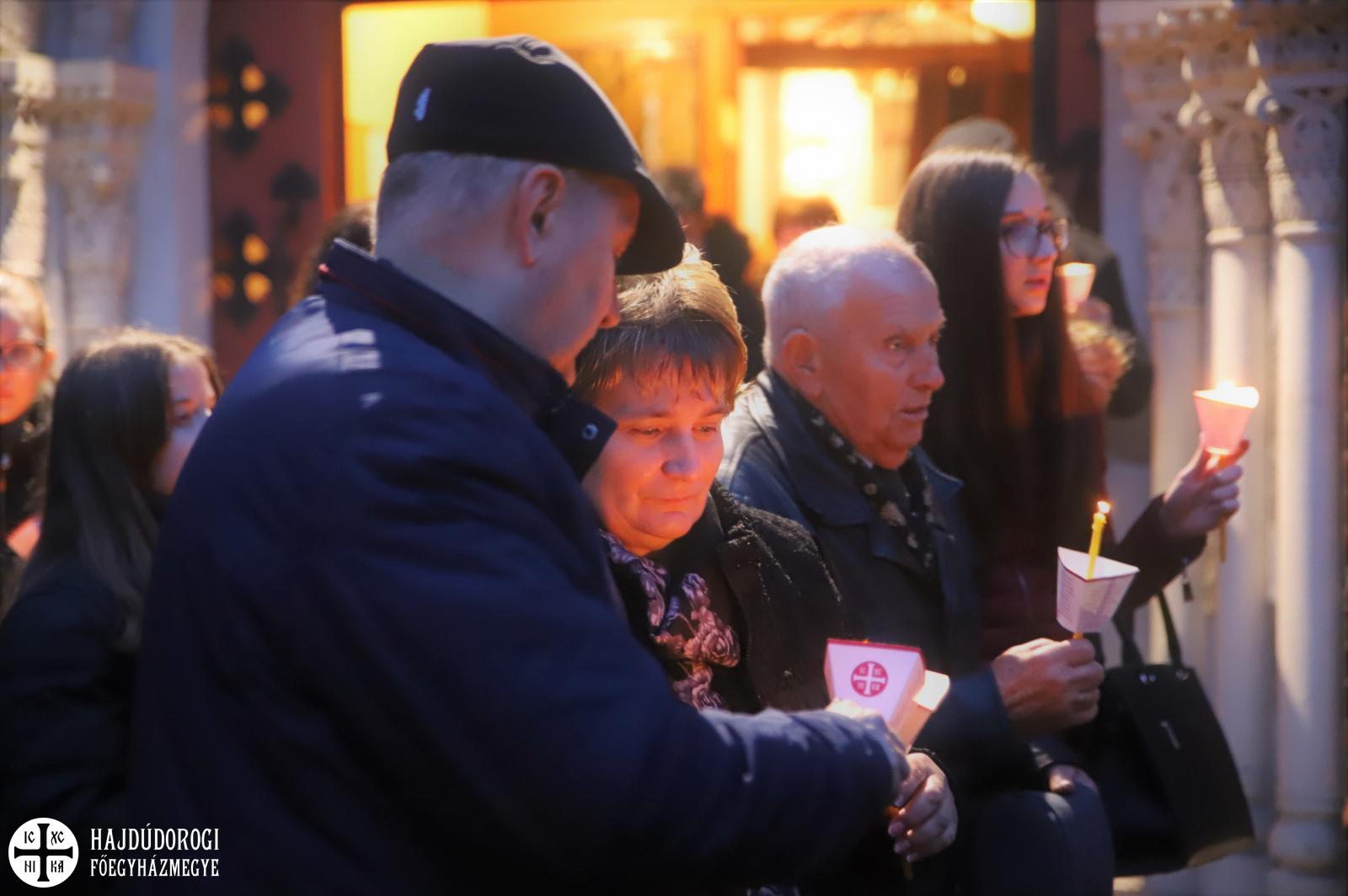 A vecsernye legszebb pillanatai voltak azok, amikor Fülöp érsek-metropolita atya háromszor megtömjénezte az oltárra terített, Krisztus testét ábrázoló sírlepelt, amit aztán a magasba emelve vittek körbe a főszékesegyház körül. A körmenet közben fennhangon énekelték a hívek a tropárt: "Az istenfélő József levevén a fáról a te legtisztább testedet, tiszta gyolcsba göngyölé és illatos szerekkel ellátva új sírba helyezé." Majd a sírlepel alatt fejet hajtva léphettek be ismét a templomba. A szertartás végén a virágokkal díszített szentsíron elhelyezték a liturgikus kendőt, amit csókkal illethettek a hívek is.