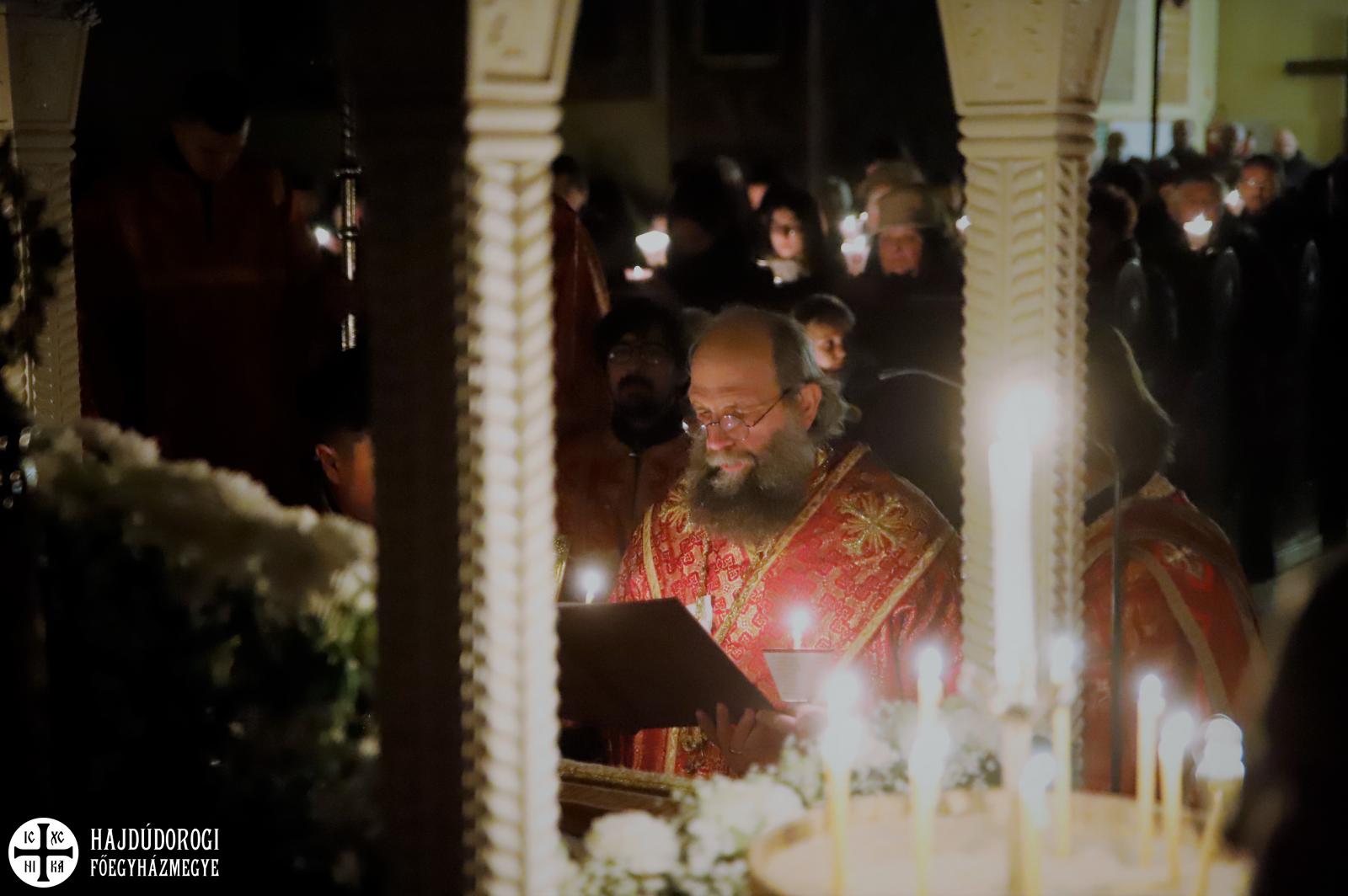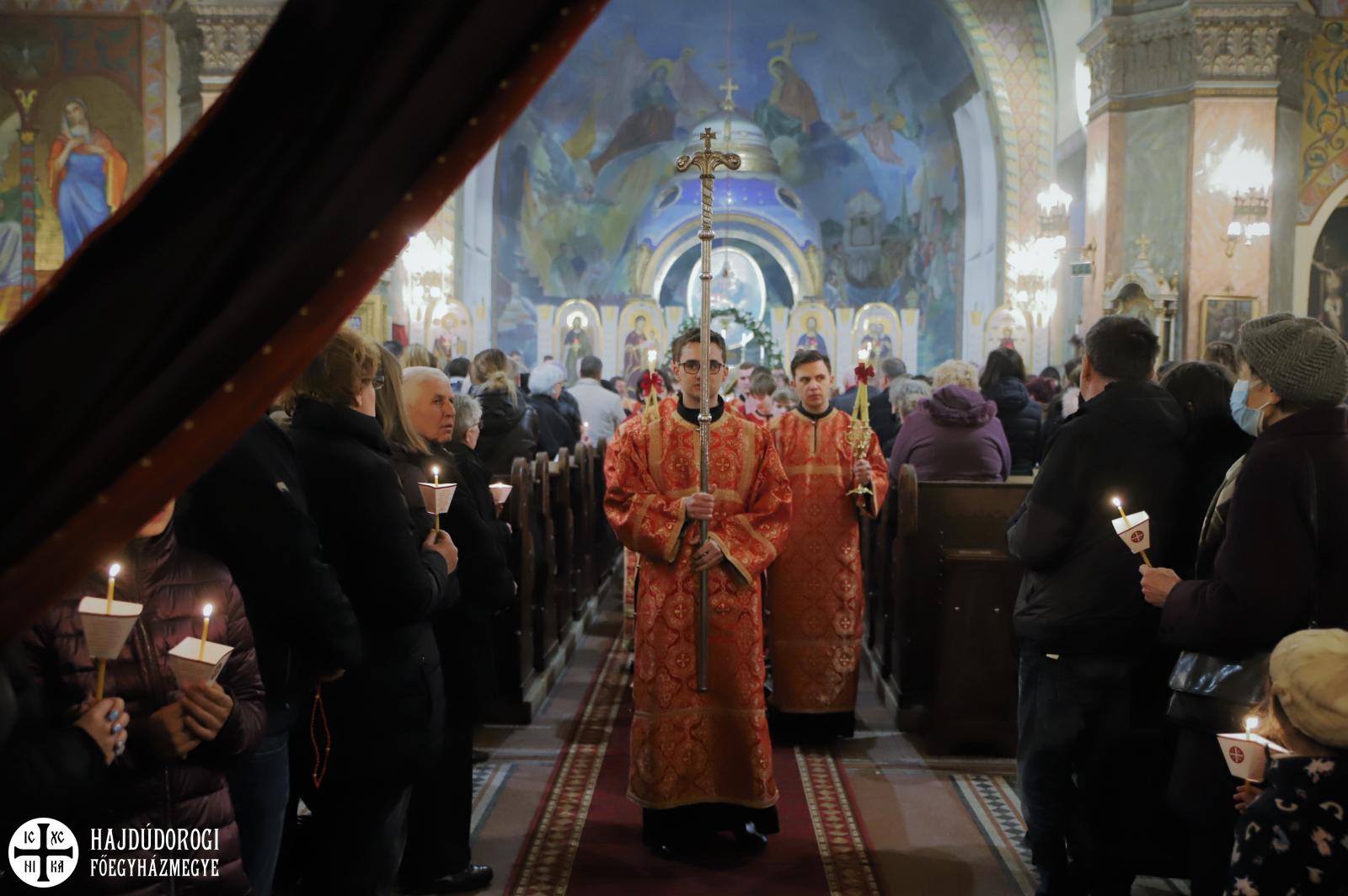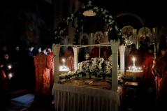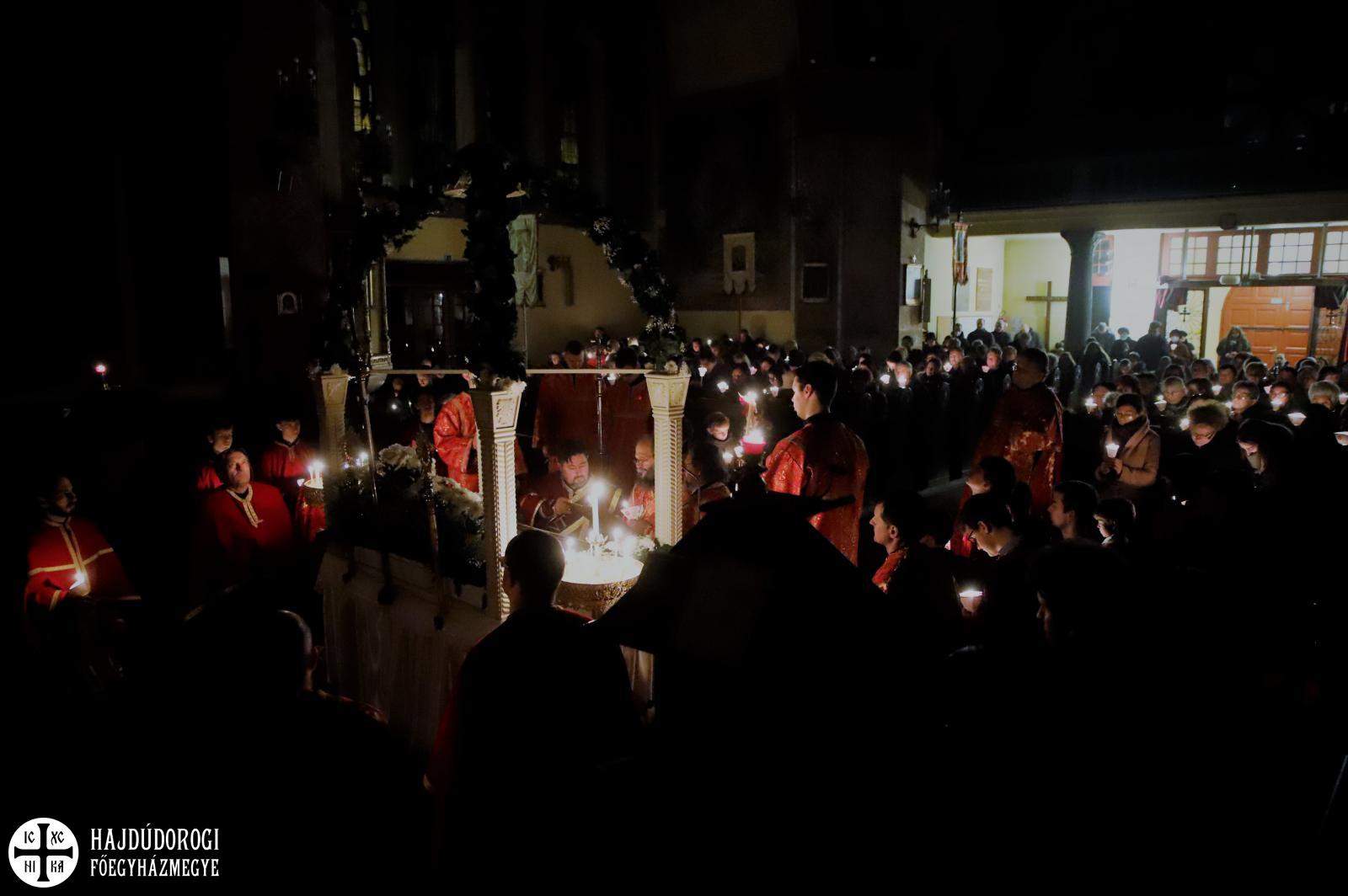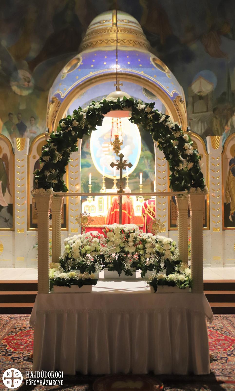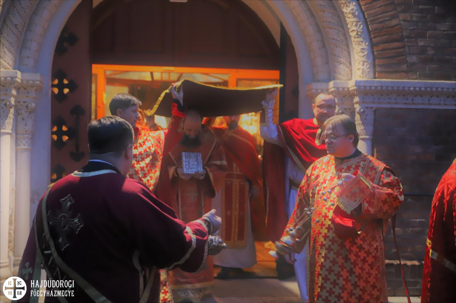 A vecsernye legszebb pillanatai voltak azok, amikor Fülöp érsek-metropolita atya háromszor megtömjénezte az oltárra terített, Krisztus testét ábrázoló sírlepelt, amit aztán a magasba emelve vittek körbe a főszékesegyház körül. A körmenet közben fennhangon énekelték a hívek a tropárt: "Az istenfélő József levevén a fáról a te legtisztább testedet, tiszta gyolcsba göngyölé és illatos szerekkel ellátva új sírba helyezé." Majd a sírlepel alatt fejet hajtva léphettek be ismét a templomba. A szertartás végén a virágokkal díszített szentsíron elhelyezték a liturgikus kendőt, amit csókkal illethettek a hívek is.