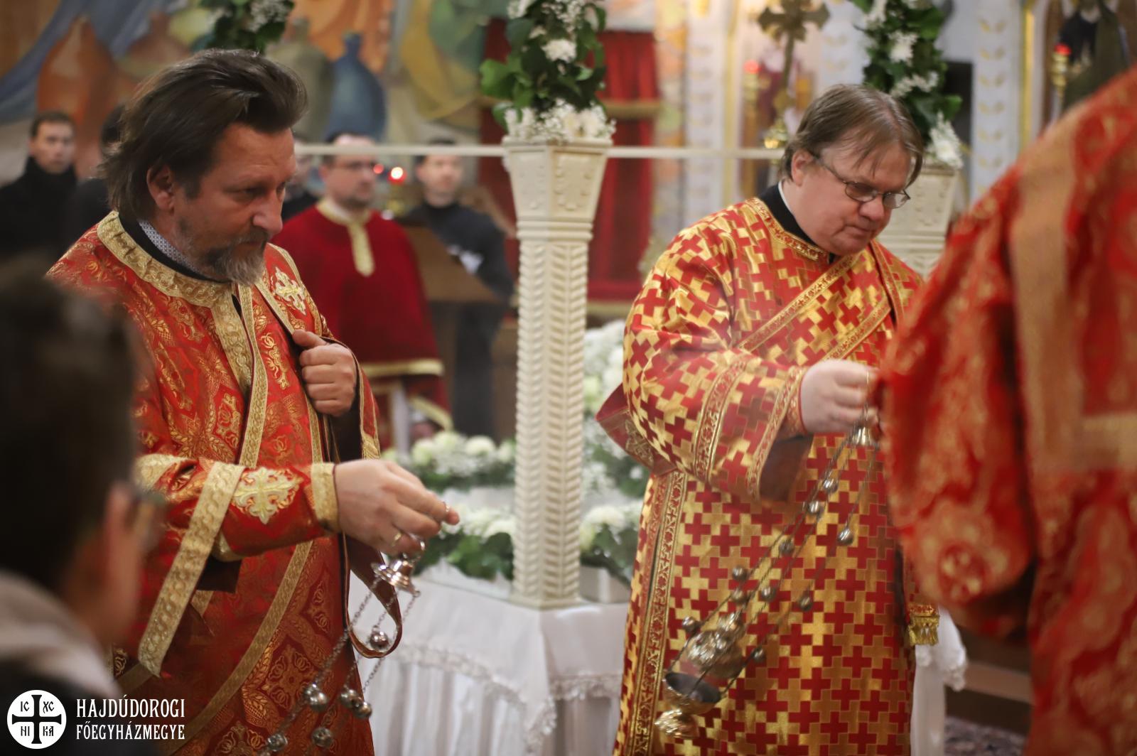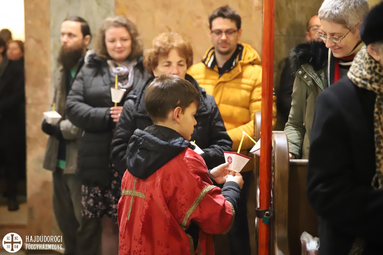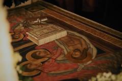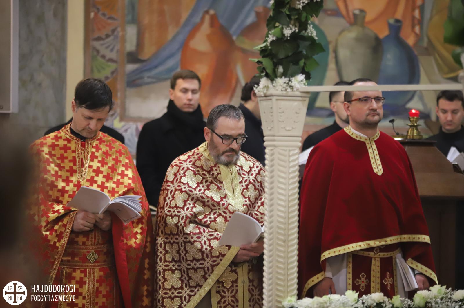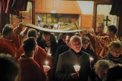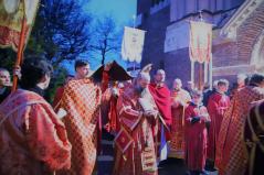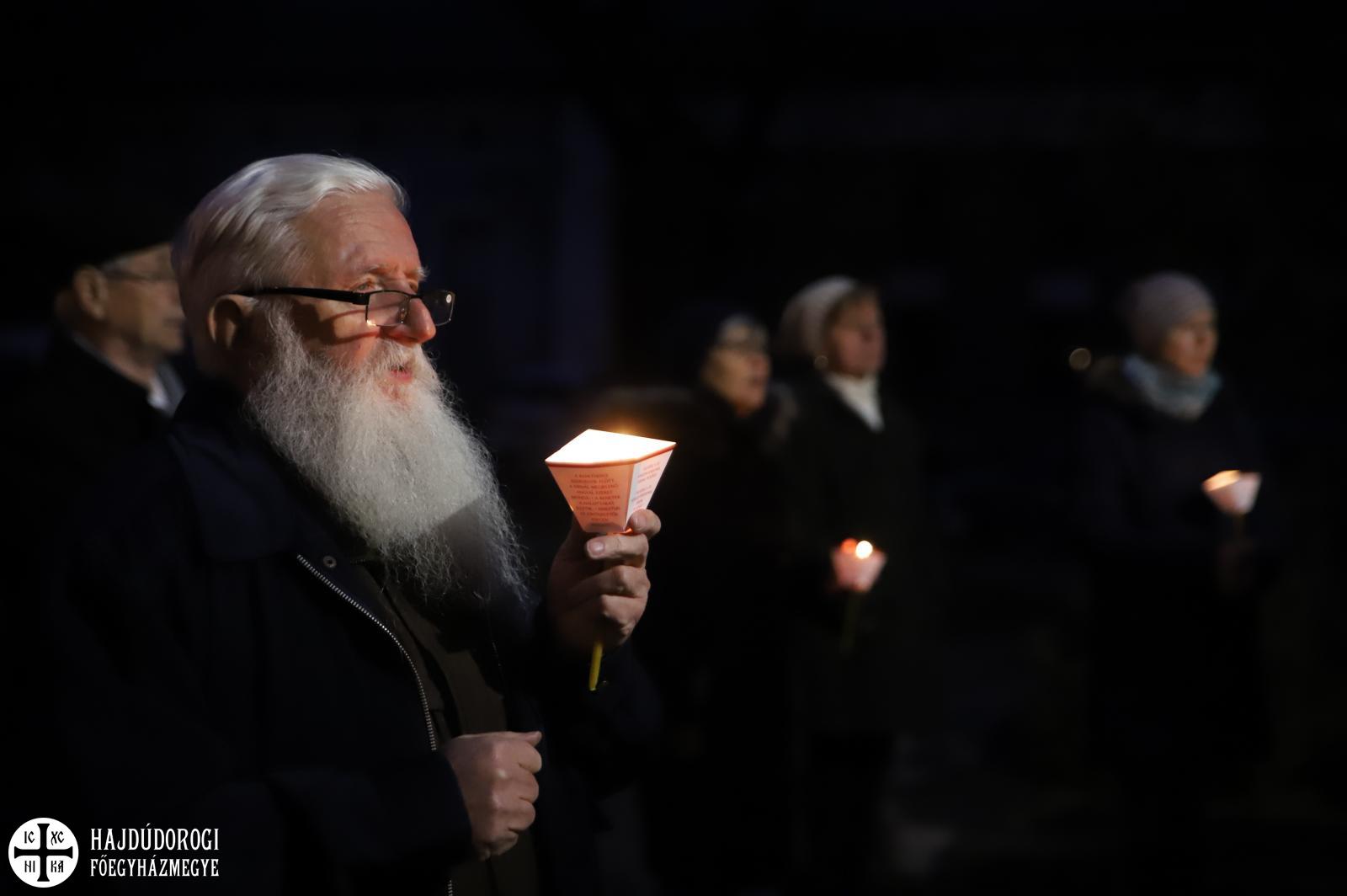 A vecsernye legszebb pillanatai voltak azok, amikor Fülöp érsek-metropolita atya háromszor megtömjénezte az oltárra terített, Krisztus testét ábrázoló sírlepelt, amit aztán a magasba emelve vittek körbe a főszékesegyház körül. A körmenet közben fennhangon énekelték a hívek a tropárt: "Az istenfélő József levevén a fáról a te legtisztább testedet, tiszta gyolcsba göngyölé és illatos szerekkel ellátva új sírba helyezé." Majd a sírlepel alatt fejet hajtva léphettek be ismét a templomba. A szertartás végén a virágokkal díszített szentsíron elhelyezték a liturgikus kendőt, amit csókkal illethettek a hívek is.