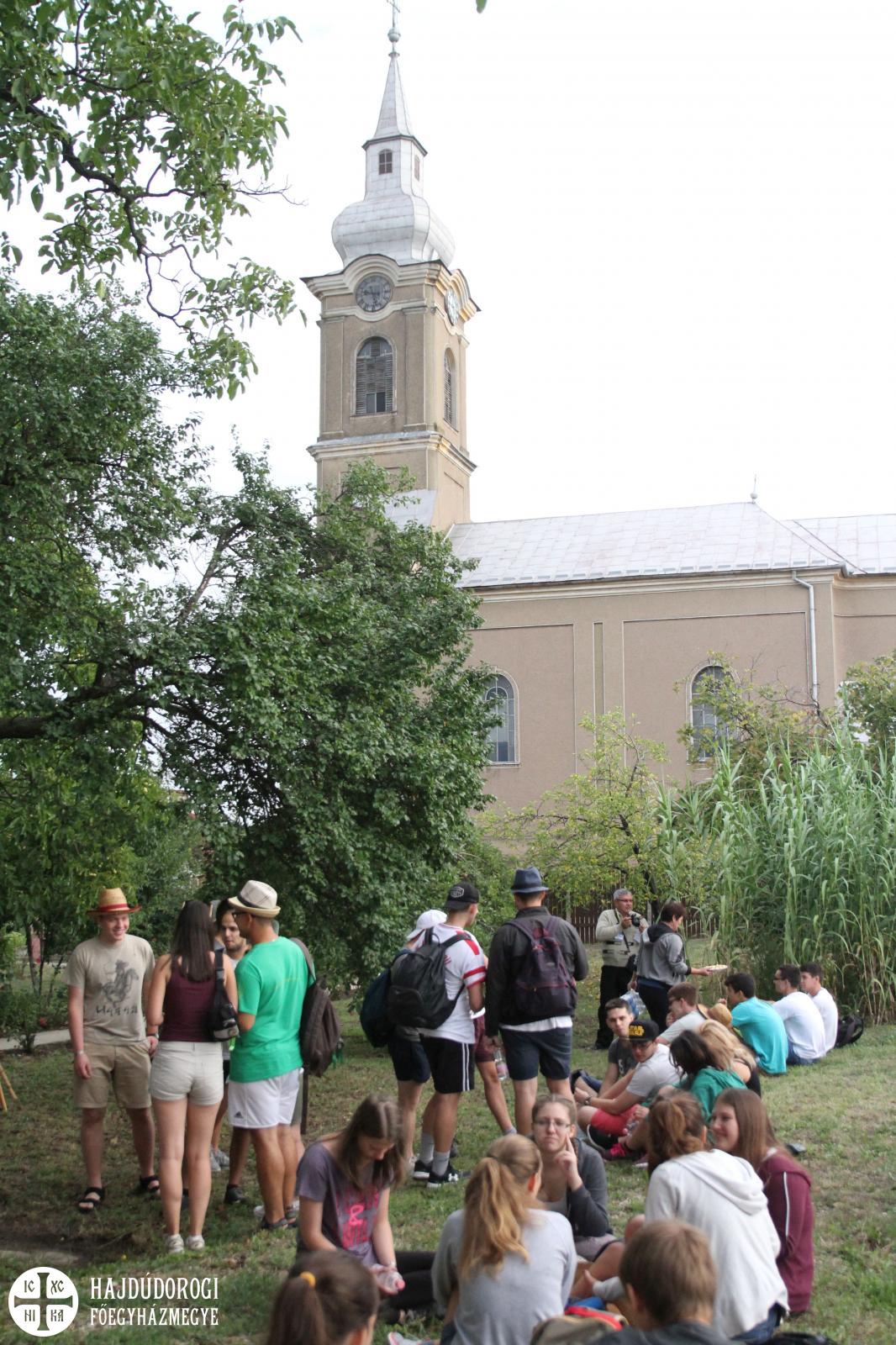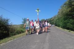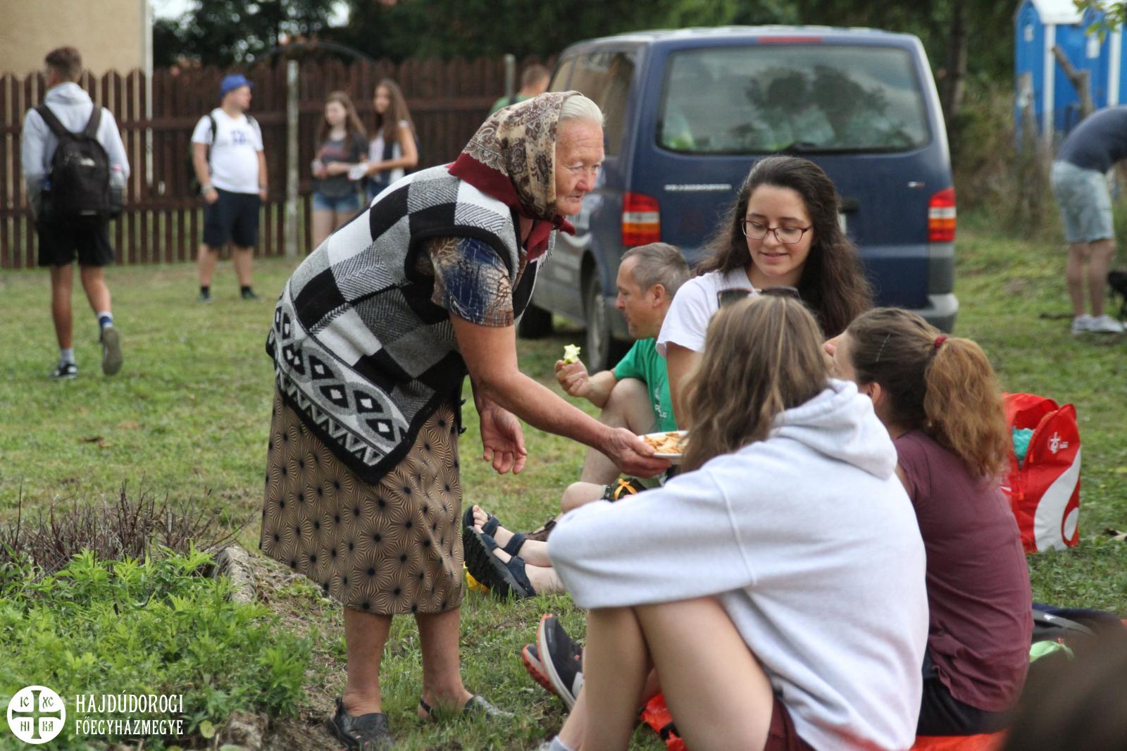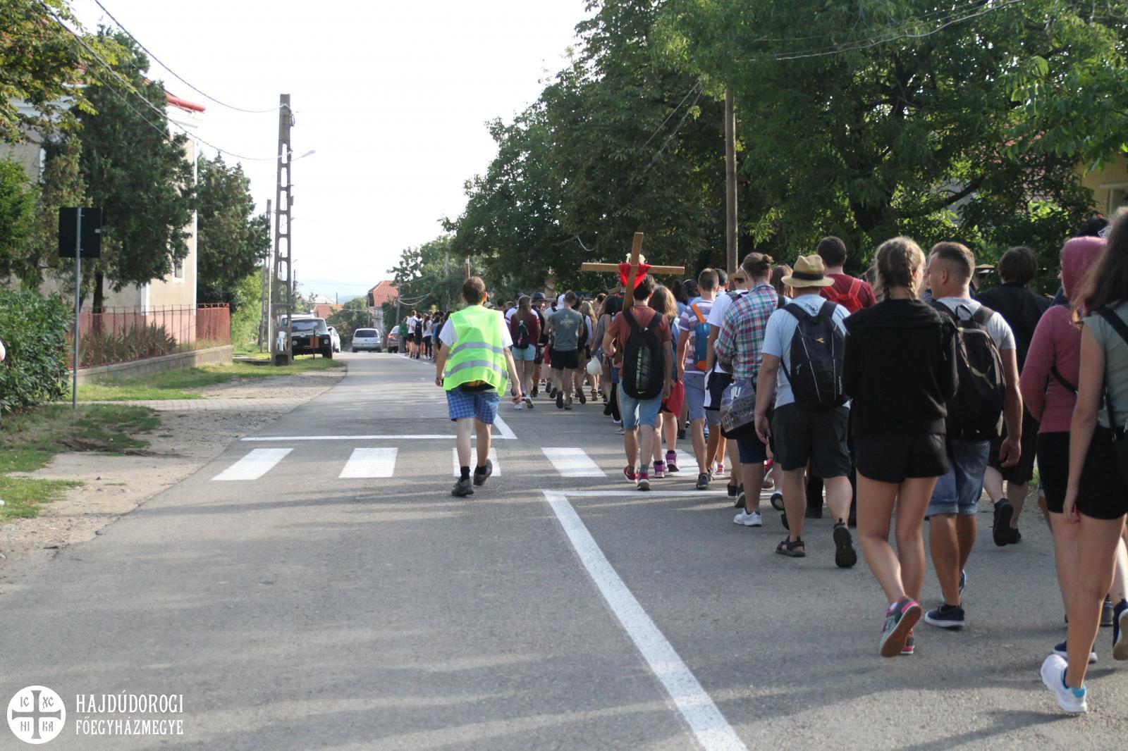Az első állomás Hegyközcsatár volt, eddig (kivételesen) busszal mentek a résztvevők, hiszen a keddi táv jócskán meghaladta volna az erőforrásokat. Az ottani egyházközség lelkes tagjai finomságokkal várták a mieinket. A rövid feltöltődés után már valóban gyalogosan folytatták útjukat a zarándokok. A bihari térség csodás tájain szelték a kilométereket. Hegynek fel, hegynek le. Többen is megjegyezték: régen láttak ilyen szép tájat.