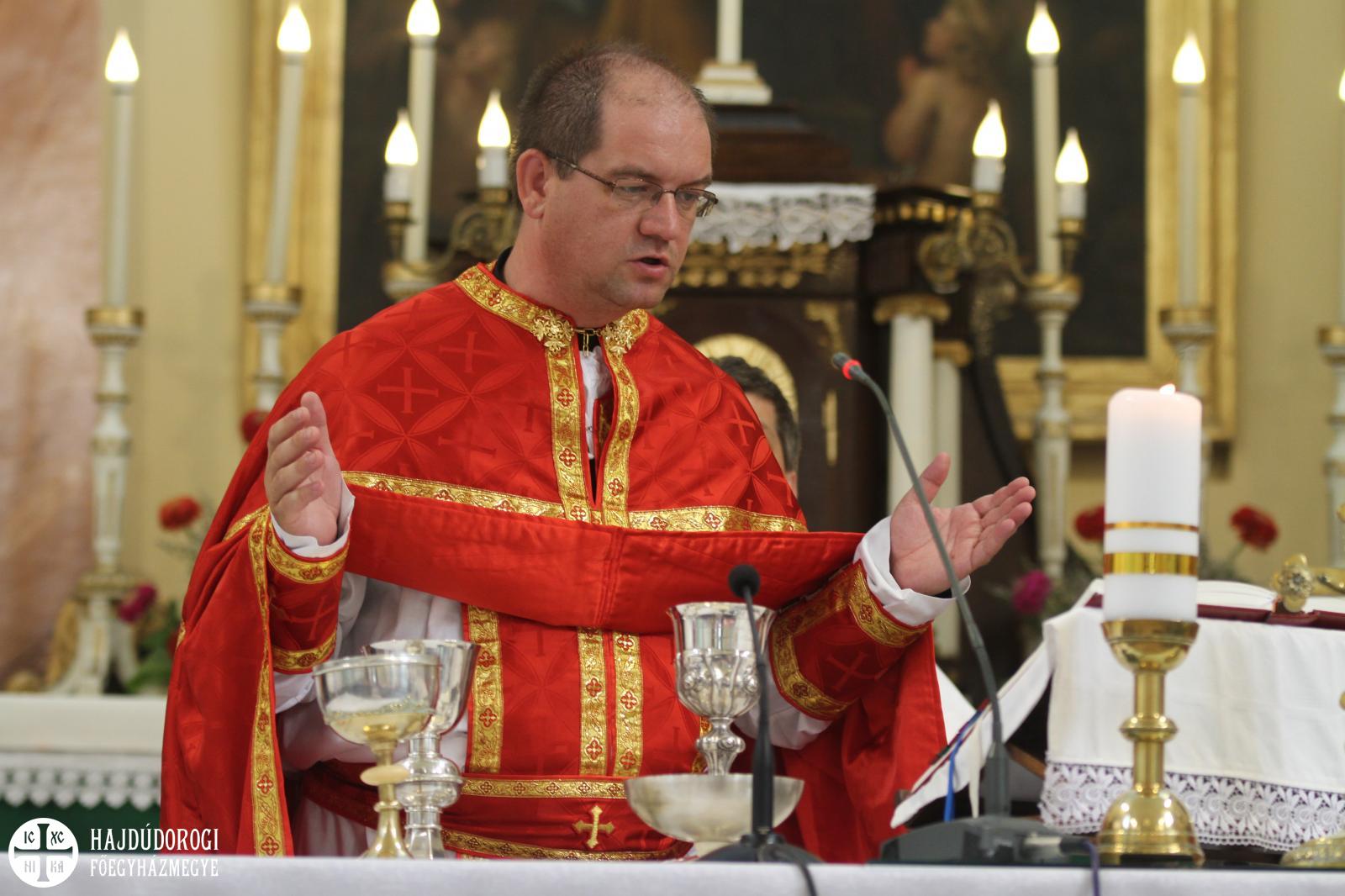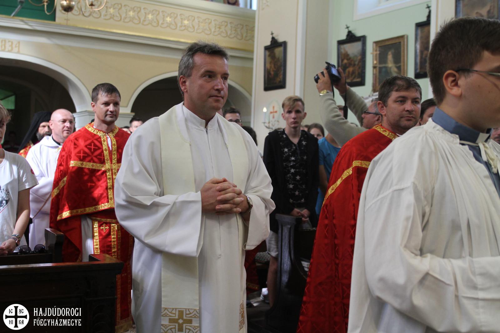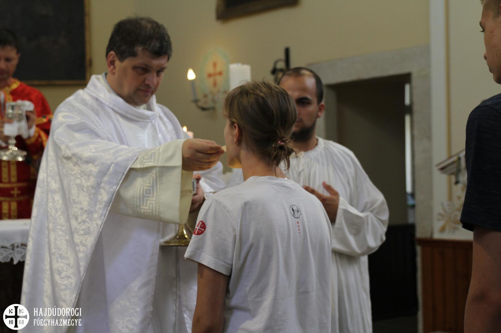 Hegyköztóttelken már nagyon várták őket. Az első útjuk a római katolikus templomba vezetett, ahol egy szent misén vettek részt, melybe bekapcsolódtak a görögkatolikus atyák is. Dr. Fügedi Antal, mezőbikácsi plébános tartotta a misét. Kocsis Fülöp metropolita prédikációjában Szent László erényeit hangsúlyozta. A mai napon az Igazságosság erényét emelte ki. „Jézus Krisztus saját magáról mondta: hogy Ő az Igazság. És minden emberi igazság csak ő belőle bontható ki. Szent László is Krisztus Igazságát közvetítette.” – mondta Fülöp atya. „Ez a zarándoklat igazából egy lelki gyakorlat. Gyakoroljuk be, hogyan tudunk Krisztusra tekinteni az életünkben. Amikor elgyengülünk, mondjuk magunkban mindig azt: én Krisztusra tekintek, mert Ő az egyetlen igazság. Tudnunk kell ugyanis, hogy Ő az egyetlen kapaszkodónk ebben a világban. És mire Máriapócsra érkezünk, megtanulunk vízen járni, mint Péter…és nem süllyedünk el, ha Krisztusra, az egyetlen Igazságra tekintünk közben!”