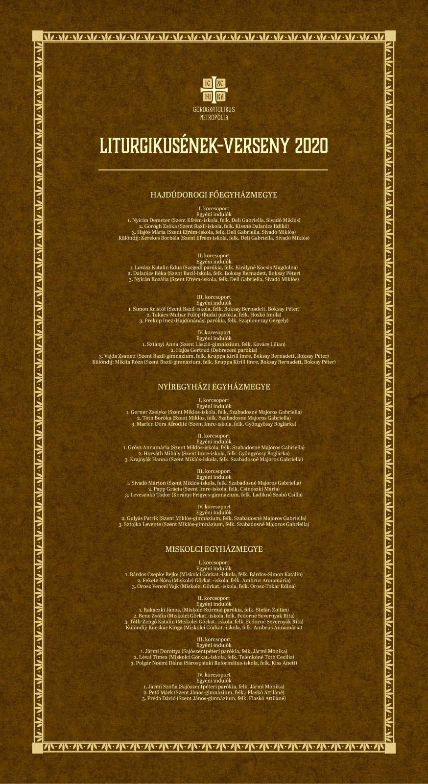 Itt közöljük azoknak a nevét, akik bejutottak az országos döntőbe, s akiktől most elektronikus úton várjuk az éneküket. Bármilyen felvételre alkalmas készülékkel el lehet készíteni a fölvételt. Nem a technika, hanem az ének minősége számít. S nem csak az ének biztos ismerete, tiszta végigéneklése, hanem annak módja is. Hiszen liturgikus énekünkkel a legtöbbször másokat is megénekeltetünk, megimádkoztatunk, ezért nem mindegy, hogyan adjuk elő a megfelelő éneket. Erre is figyelni kell tehát.