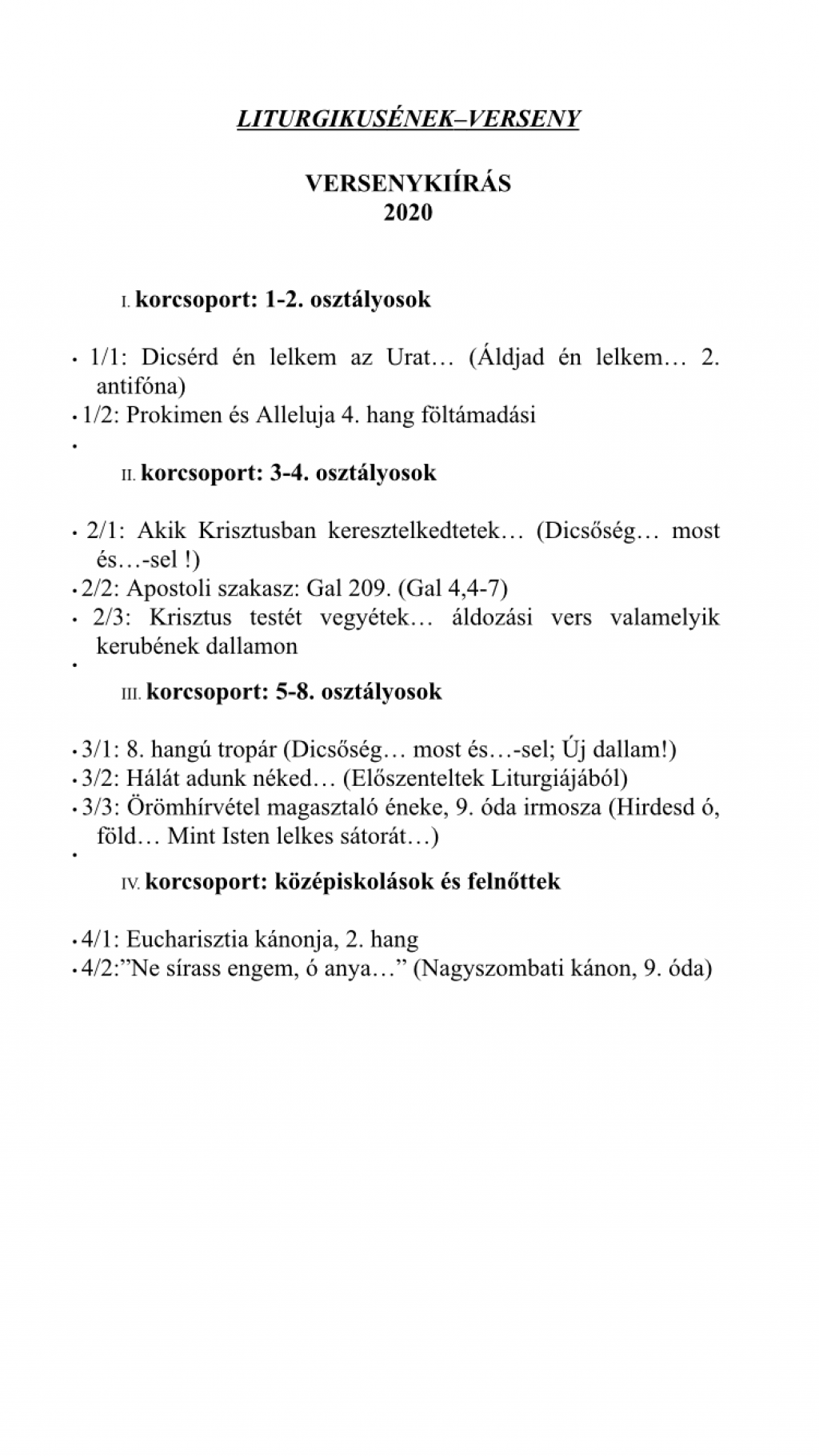 Gratulálunk mindazoknak, akik bejutottak a döntőbe, s nagyon bízunk abban, hogy mindegyiküktől megkapjuk a fölvételt a liturgikusenekverseny@gmail.com címre. Fontos, hogy a fölvétel azzal kezdődjék, hogy 1. az illető személy bemutatkozik, 2. bemondja a helyszínt, ahonnan énekel és 3. azt, hogy melyik korcsoportba tartozik, utána pedig már 4. énekelheti is a kijelölt énekeket. Ugyanezeket az adatokat pedig az elküldött felvétel mellé is kérjük beírni (név, helyszín, korcsoport).