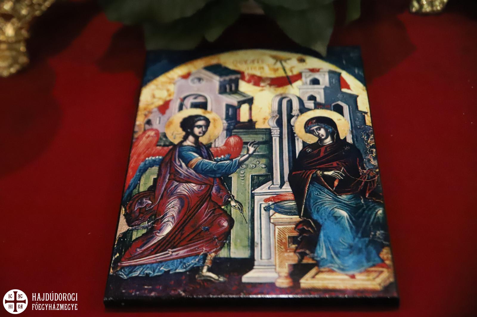 S valójában az az örömhír, hogy a leány igent mondott az Isten által rábízott titkokra. Ha ott Mária elkezd hárítani, mint az első Éva vagy Mózes vagy a próféták közül sokan, akkor nem teljesült volna be az Istennek az akarata – figyelmeztetett a főpásztor. Micsoda „őrült isteni terv” ez, hogy Isten egy egyszerű leányra bízza az egész emberiség megváltásának titkát. De tudta jól a Teremtő, hogy melyik városba, melyik házba, kihez küldje Gábor arkangyalt. Mária alázatosan igent mondott, és ezzel megnyílt számunkra az üdvösség útja. Fülöp metropolita tanításában arra is kitért az ünnep kapcsán, hogy nem véletlen, hogy a bizánci templomokban az Örömhírvételt ábrázoló ikon az egész templom az egész liturgia középső pontján helyezkedik el. A királyi ajtó ikonján látjuk ezt a jelenetet.