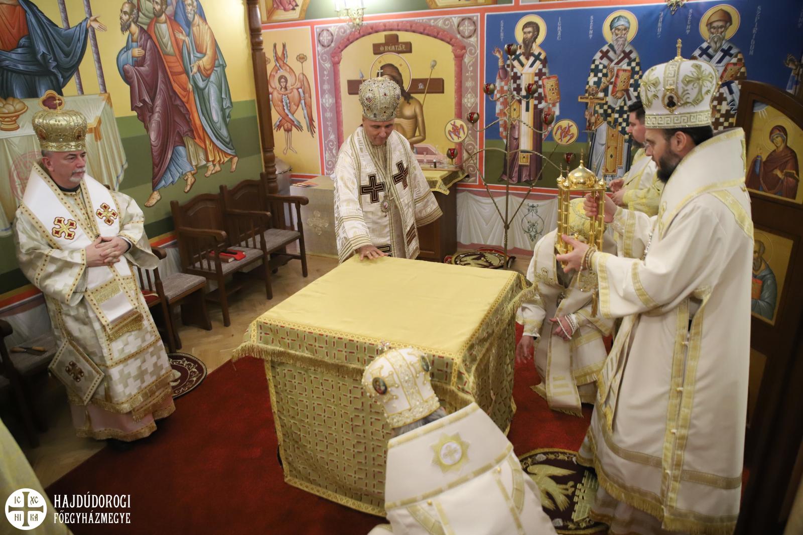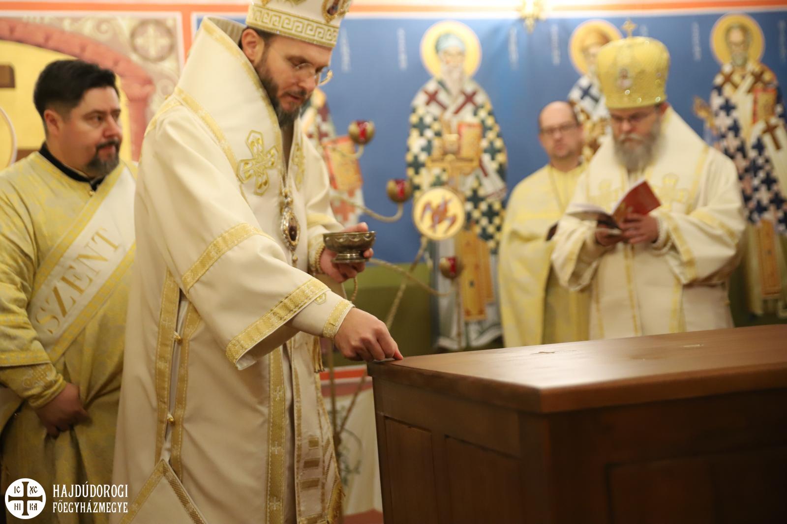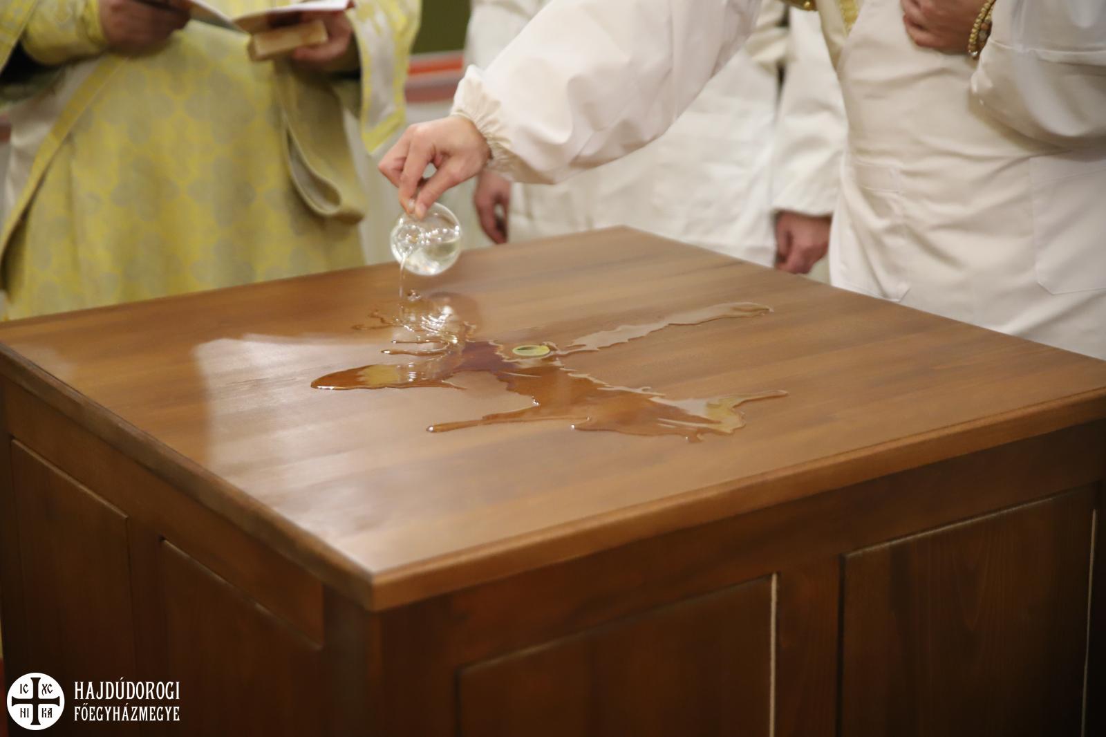A szentelés legelején az elhelyezendő ereklyék (Szent Flórusz és Laurusz vértanúknak az ereklyéi) díszes menetben érkeztek meg a kápolna bejáratához, majd a püspökök, papok és hívek egymás után léptek be a helyiségbe. Az ereklyék ünnepélyes elhelyezése után vörösborral és rózsavízzel mosták le az oltárt, majd szappannal kereszt alakban megjelölték az oltár lapját, és kezükkel átmosták azt. Miután az oltárt a kendőkkel teljesen szárazra törölték, az oltár fölkenése és felöltöztetése következett. A szentelés következő mozzanata, melyet már a hívek is láthattak, az a templom falainak megszentelése volt. Atanáz püspök müróval kente meg, Ábel püspök szenteltvízzel hintette meg, Fülöp metropolita pedig tömjénezővel áldotta meg a falakat.