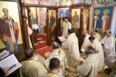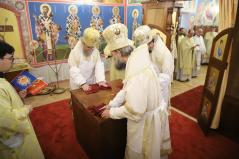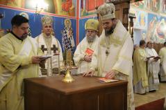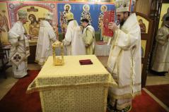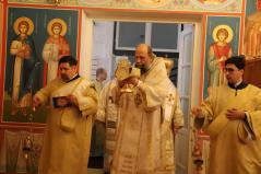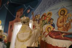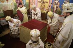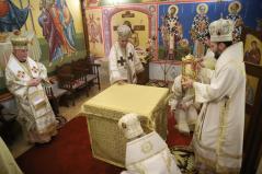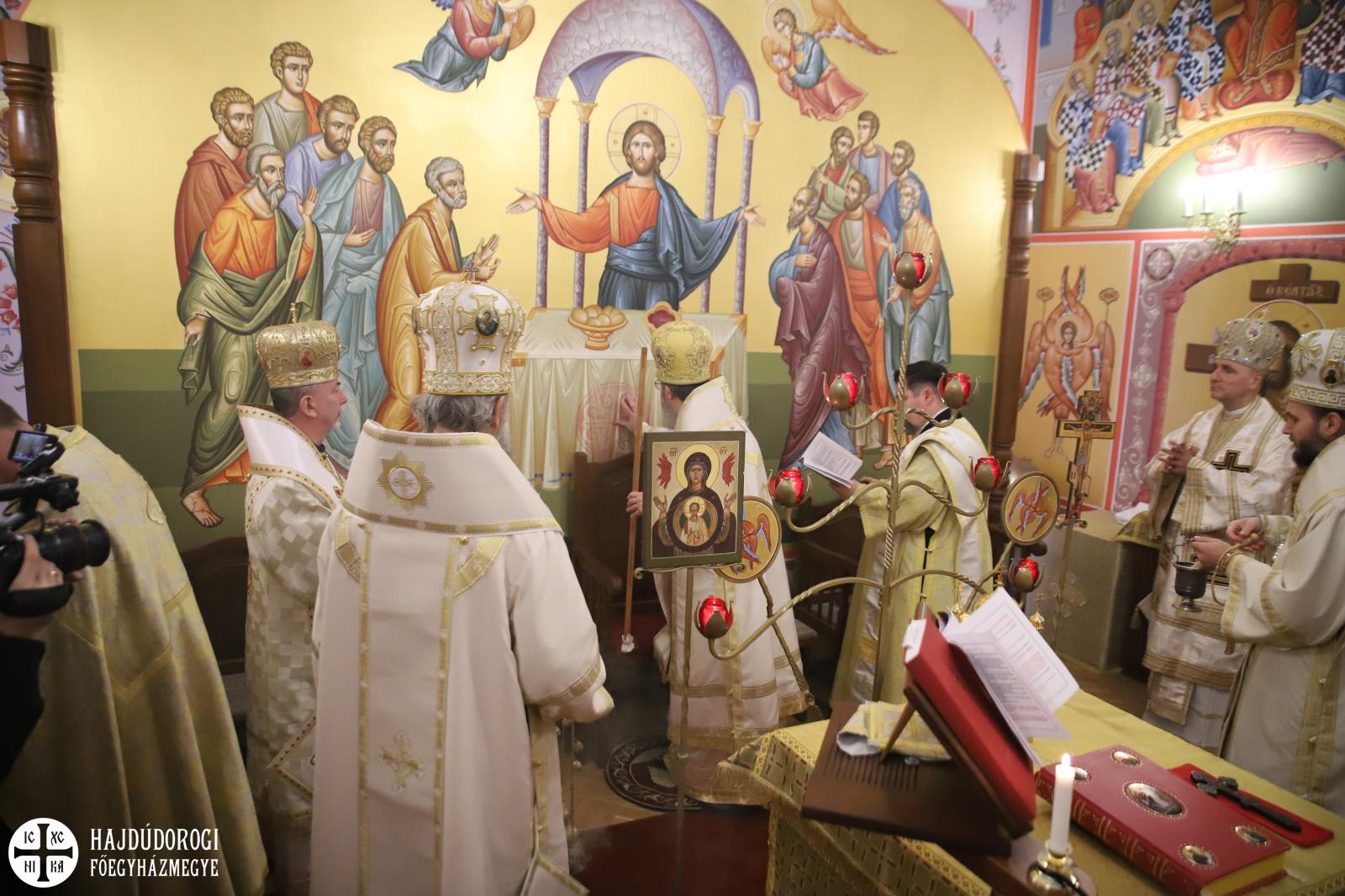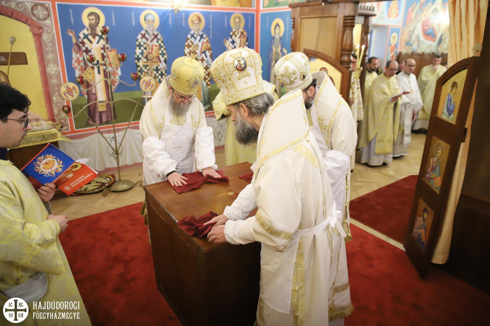 A szentelés legelején az elhelyezendő ereklyék (Szent Flórusz és Laurusz vértanúknak az ereklyéi) díszes menetben érkeztek meg a kápolna bejáratához, majd a püspökök, papok és hívek egymás után léptek be a helyiségbe. Az ereklyék ünnepélyes elhelyezése után vörösborral és rózsavízzel mosták le az oltárt, majd szappannal kereszt alakban megjelölték az oltár lapját, és kezükkel átmosták azt. Miután az oltárt a kendőkkel teljesen szárazra törölték, az oltár fölkenése és felöltöztetése következett. A szentelés következő mozzanata, melyet már a hívek is láthattak, az a templom falainak megszentelése volt. Atanáz püspök müróval kente meg, Ábel püspök szenteltvízzel hintette meg, Fülöp metropolita pedig tömjénezővel áldotta meg a falakat.