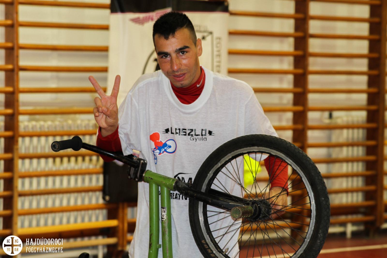 A hajdúhadházi fiatalember számos magyar rekordot állított már fel. Ő volt például, aki egy 22 emeletes épületből úgy lépcsőzött le, hogy közben végig a homlokán egyensúlyozott egy labdával. Idén októberben úgy döntött, hogy egy korábbi kerékpáros rekordját dönti meg: a bicaj első tengelyén állva körbe-körbe kerekezve vállalta, hogy minél többször veszi le és vissza fel a pólóját. Ez eddig 12-szer jött neki össze. Most nagyközönség előtt kísérelte meg ezt túlszárnyalni.