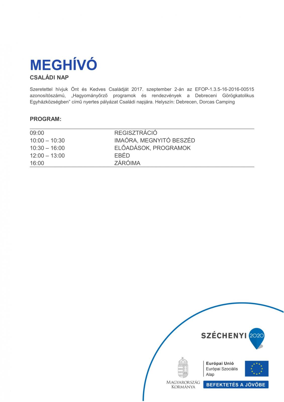 Szeretettel hívjuk Önt és Kedves Családját 2017. szeptember 2-án a Családi napra. Helyszín: Debrecen, Dorcas Camping, részletek a meghívóban.