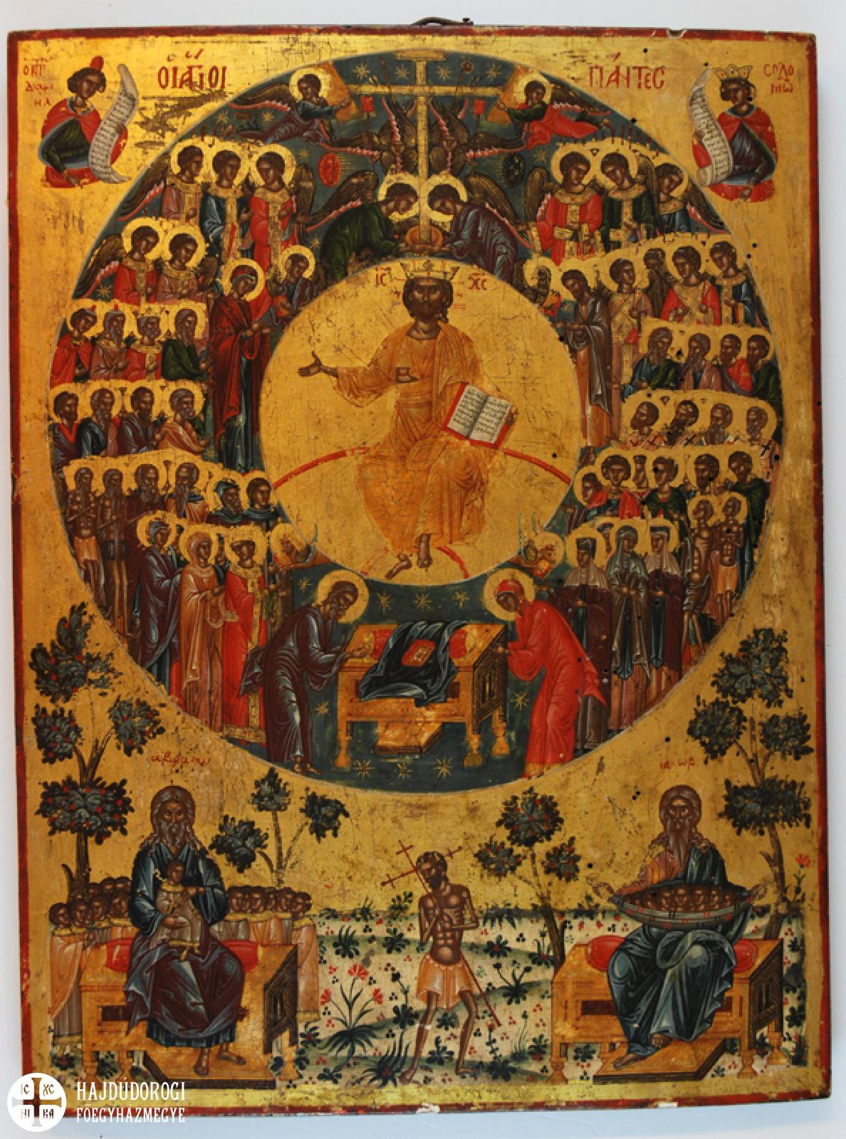 A keresztelő előhírnököt, az apostolokat, prófétákat, vértanúkat és szentéletűeket, a fölszentelt vértanúkat, s velük az istenszerető asszonyokat s az összes igazéletűeket és az angyali rendeket méltó himnuszokkal koszorúzzuk, kérvén Krisztus Istenünket, hogy mi is elnyerhessük ezek dicsőségét. (Ikosz, utrenye)