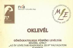 A Magyar Levéltárosok Egyesülete tavaly is meghirdette Az év levéltári kiadványa pályázatát, a legjobbnak ítélt levéltári kiadványokat három kategóriában nevezték a pályázatra országszerte: monográfiák, tanulmánykötetek és levéltári adatbázisok mellett a forráskiadványok kategóriájában. Ez utóbbiban a Görögkatolikus Püspöki Levéltár által indított legújabb kiadvány, a Mindnyájunk közös kincse lett a harmadik helyezett.
