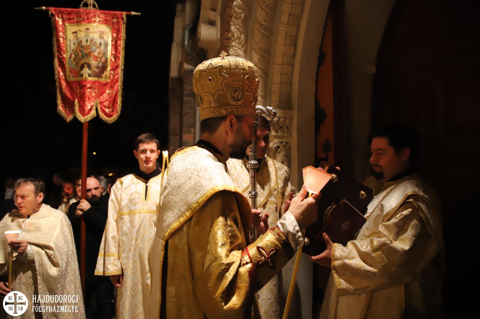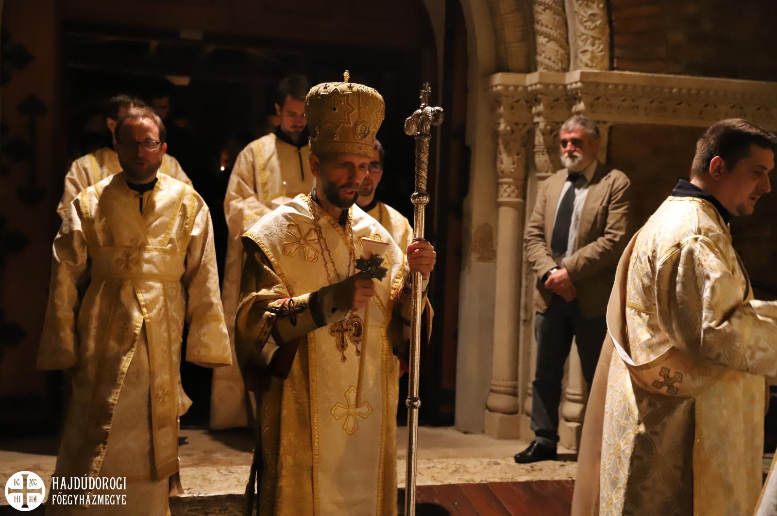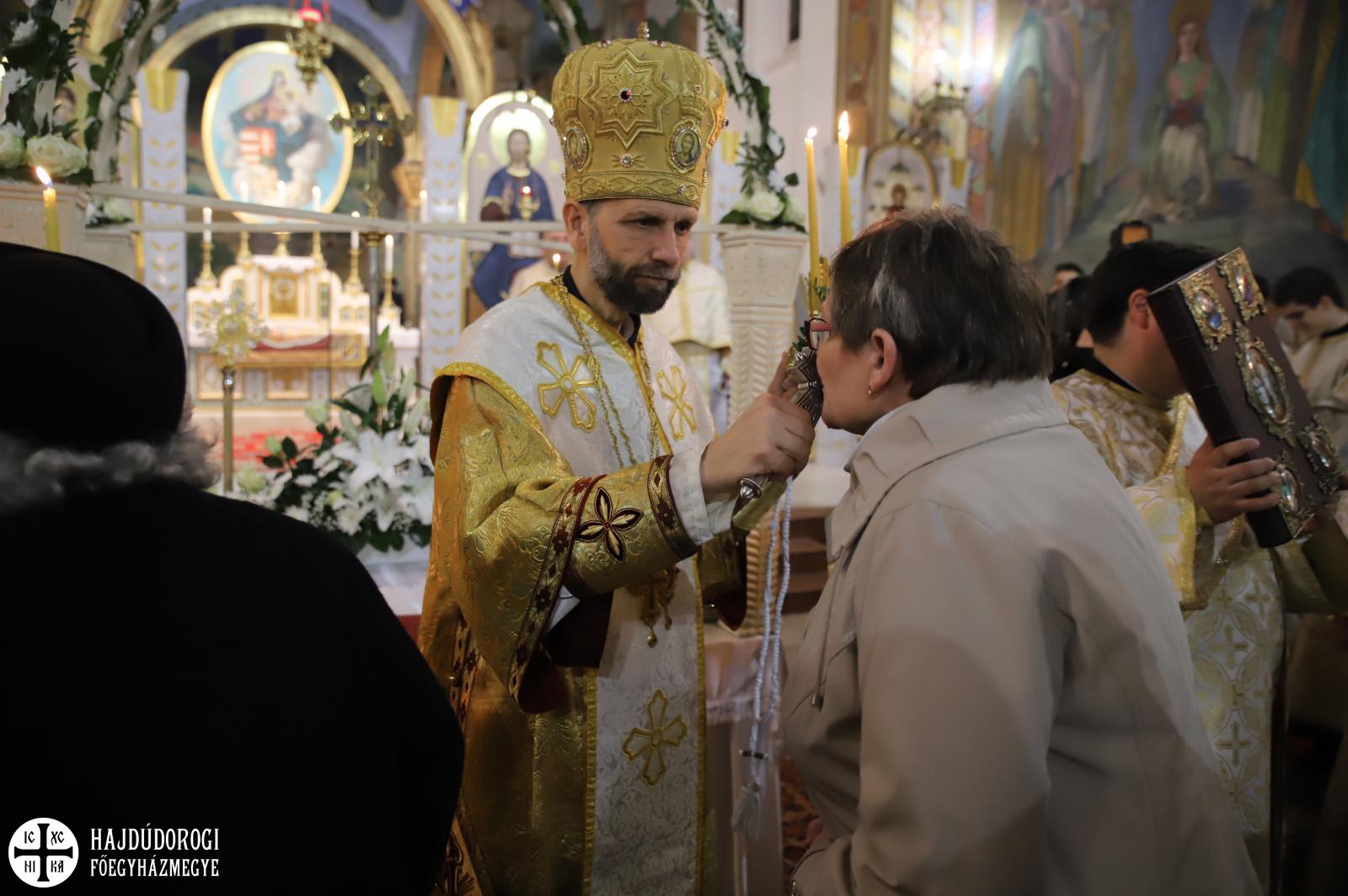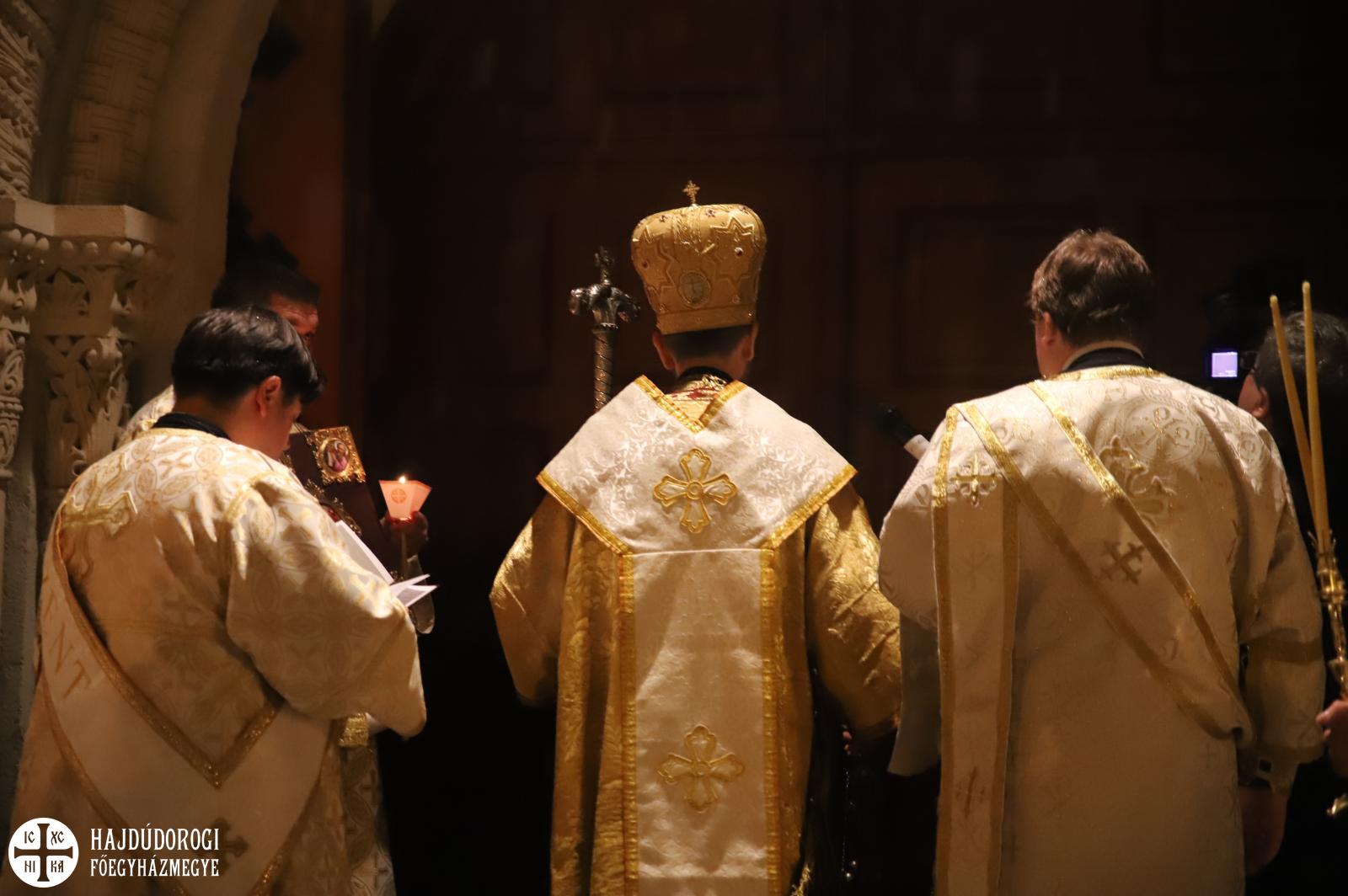 Ezt követően azonnal kezdődött a püspöki Szent Liturgia, melynek során a testvérek - tiszteletük kifejezéséül - elsőként a Bibliát, aztán a keresztet és végül egy Jézust ábrázoló ikont csókoltak meg a „Feltámadt Krisztus! Valóban feltámadt!” köszönés kíséretében. Majd a metropolita felolvasta Aranyszájú Szent János hittanító beszédét, ami a Krisztussal való teljes közösség megújítására hív.