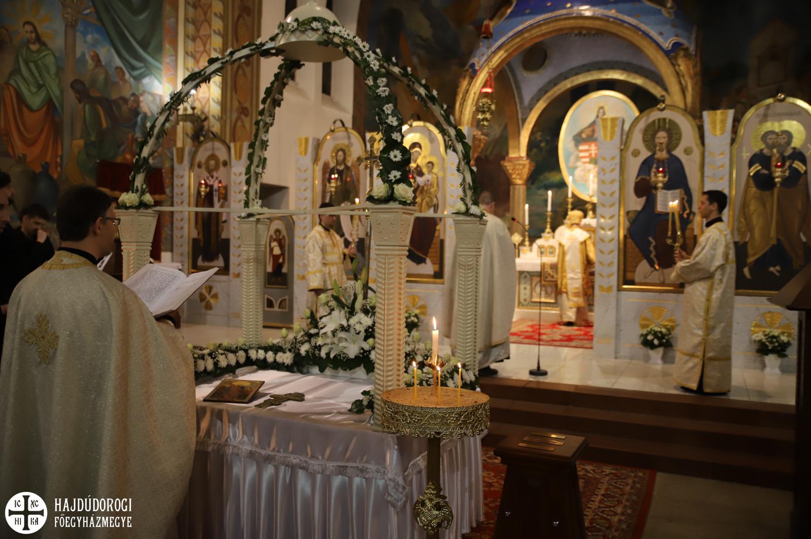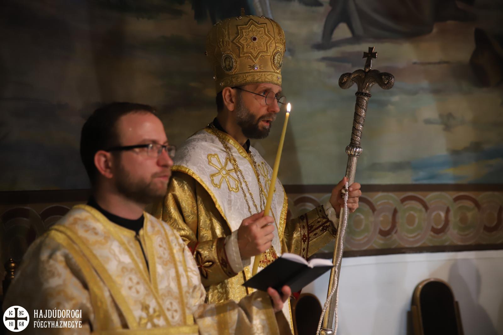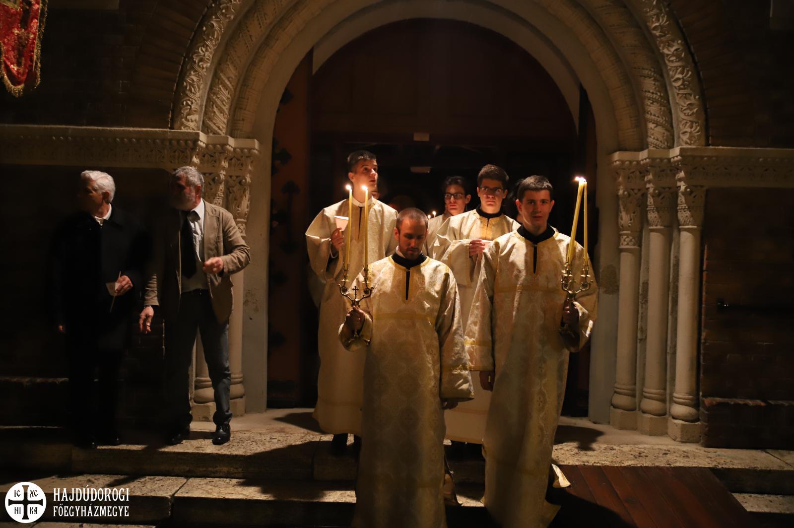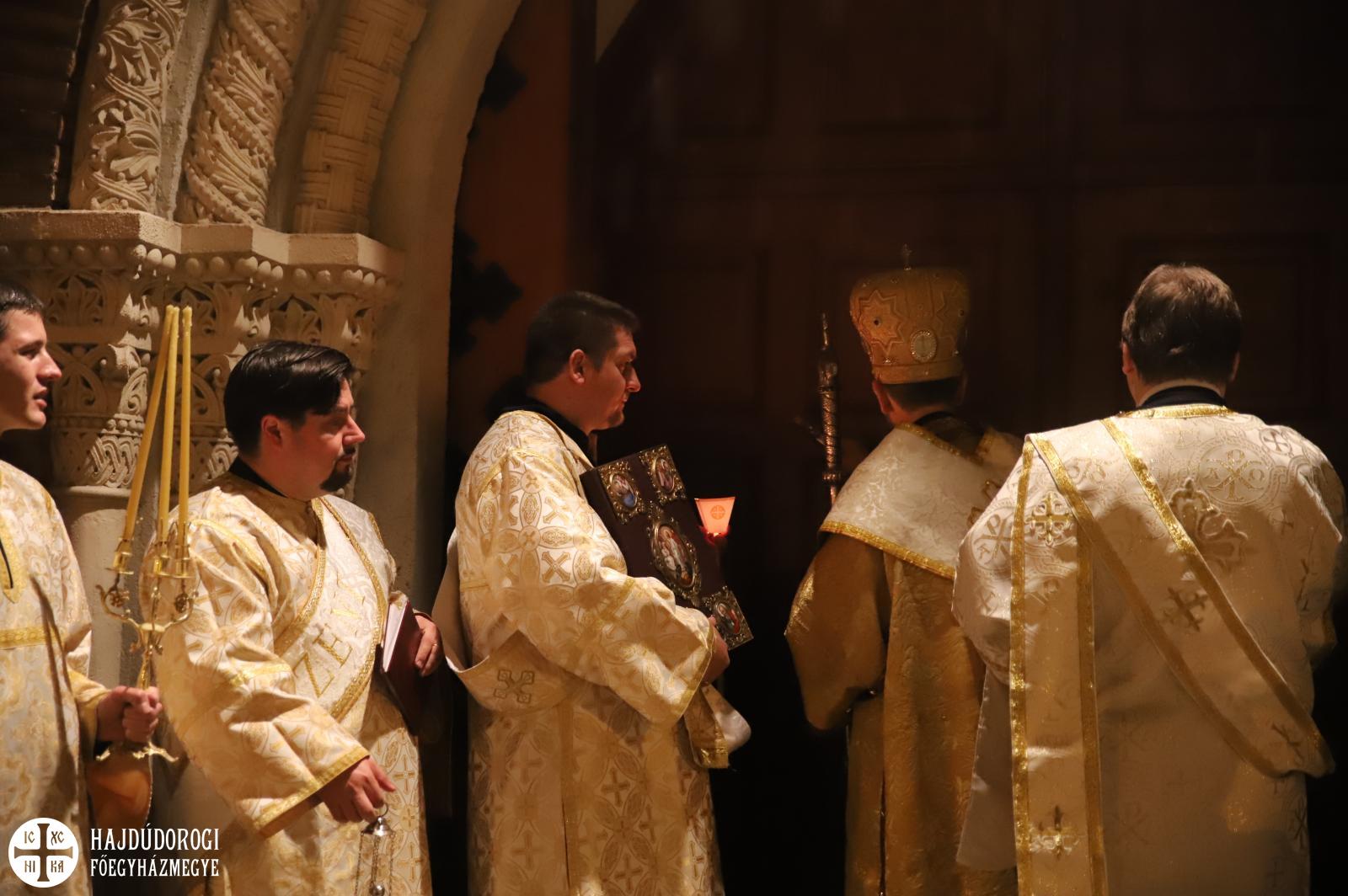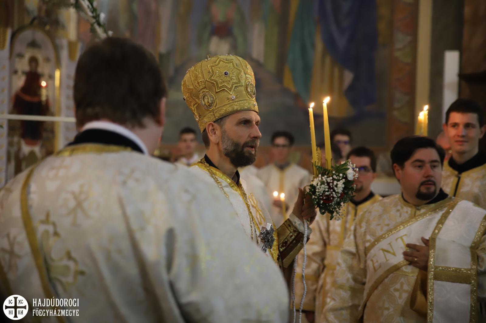 Ezt követően azonnal kezdődött a püspöki Szent Liturgia, melynek során a testvérek - tiszteletük kifejezéséül - elsőként a Bibliát, aztán a keresztet és végül egy Jézust ábrázoló ikont csókoltak meg a „Feltámadt Krisztus! Valóban feltámadt!” köszönés kíséretében. Majd a metropolita felolvasta Aranyszájú Szent János hittanító beszédét, ami a Krisztussal való teljes közösség megújítására hív.