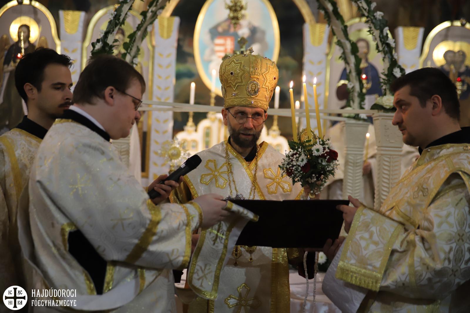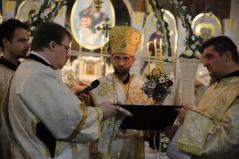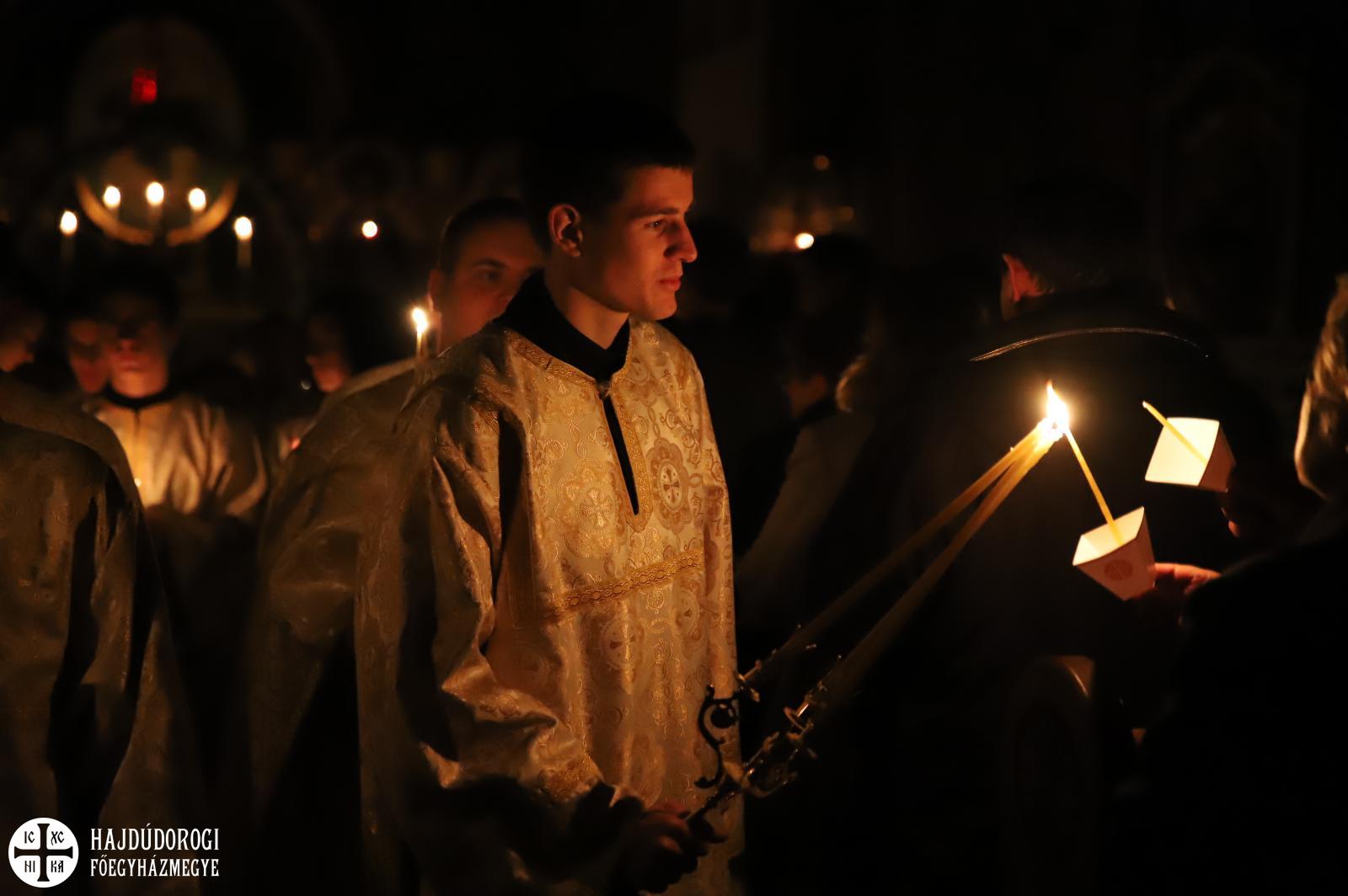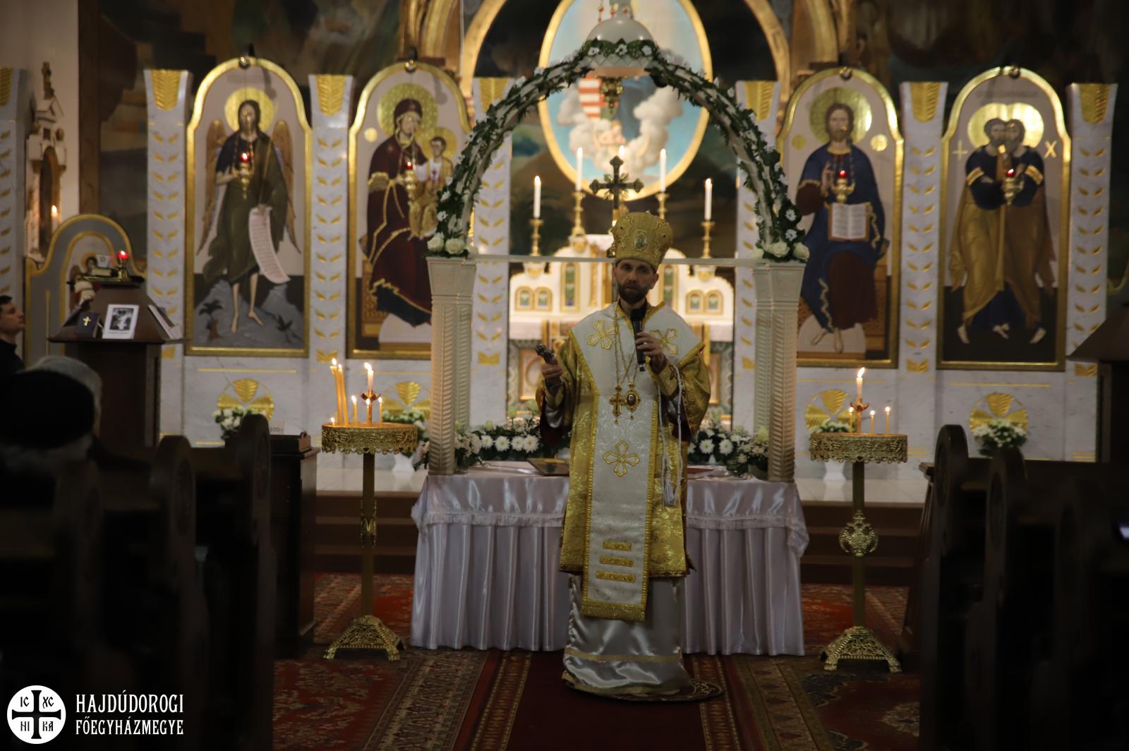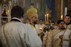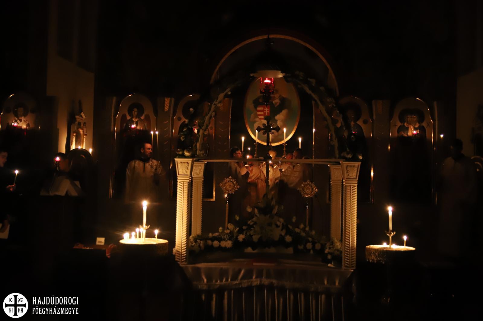 Ezt követően azonnal kezdődött a püspöki Szent Liturgia, melynek során a testvérek - tiszteletük kifejezéséül - elsőként a Bibliát, aztán a keresztet és végül egy Jézust ábrázoló ikont csókoltak meg a „Feltámadt Krisztus! Valóban feltámadt!” köszönés kíséretében. Majd a metropolita felolvasta Aranyszájú Szent János hittanító beszédét, ami a Krisztussal való teljes közösség megújítására hív.