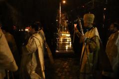 Ezt követően a papság gyertyával, kézi kereszttel, körmenetre indult, harangzúgás közepette. A harangok most zúghattak először a kínszenvedésre való emlékezés óta. A hívek meggyújtották gyertyáikat a papok gyertyájáról, így járták körül a templomot, énekelve, felidézve a kenethozó asszonyok menetét a Megváltó sírjához. A körmenet után a metropolita felolvasta a templomajtóban a feltámadásról szóló evangéliumi részeket majd kereszt alakban megkopogtatta az ajtót és belépett a hívekkel.