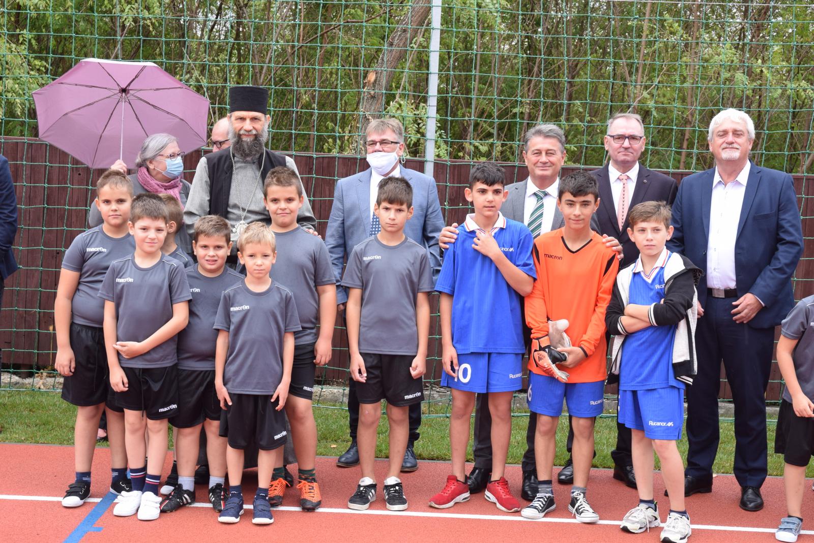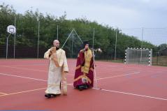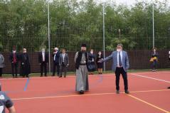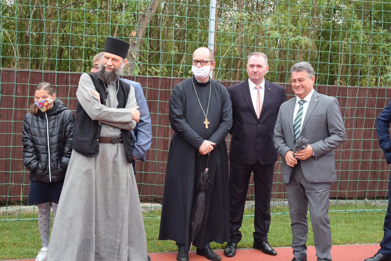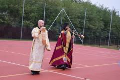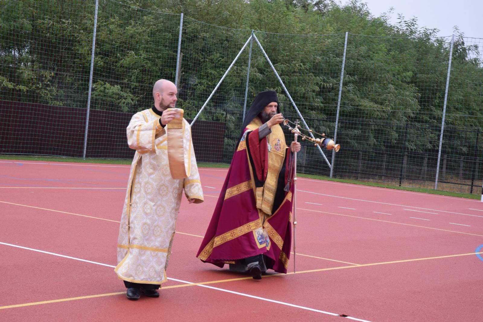 Az ünnepség elején Kocsis Fülöp érsek-metropolita felszentelte a pályát, majd az eső elől biztonságot nyújtó sátor alatt végzett szentelő szertartást, ahol Tatai Zoltán iskolalelkész liturgikus énekkara is részt vett.