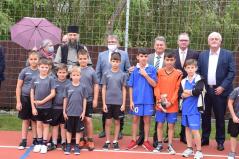 Az ünnepség végén a vendégek megtekinthették az új pályát, miközben az iskola labdarúgói és aerobikos lányai egy-egy látványos bemutatóval elsőként vették birtokba az új létesítményt. A szitáló eső ellenére érsek atya, képviselő úr és igazgató úr is vállalkozott egy-egy kezdőrúgásra a jelenlévők, de főként a gyerekek örömére.