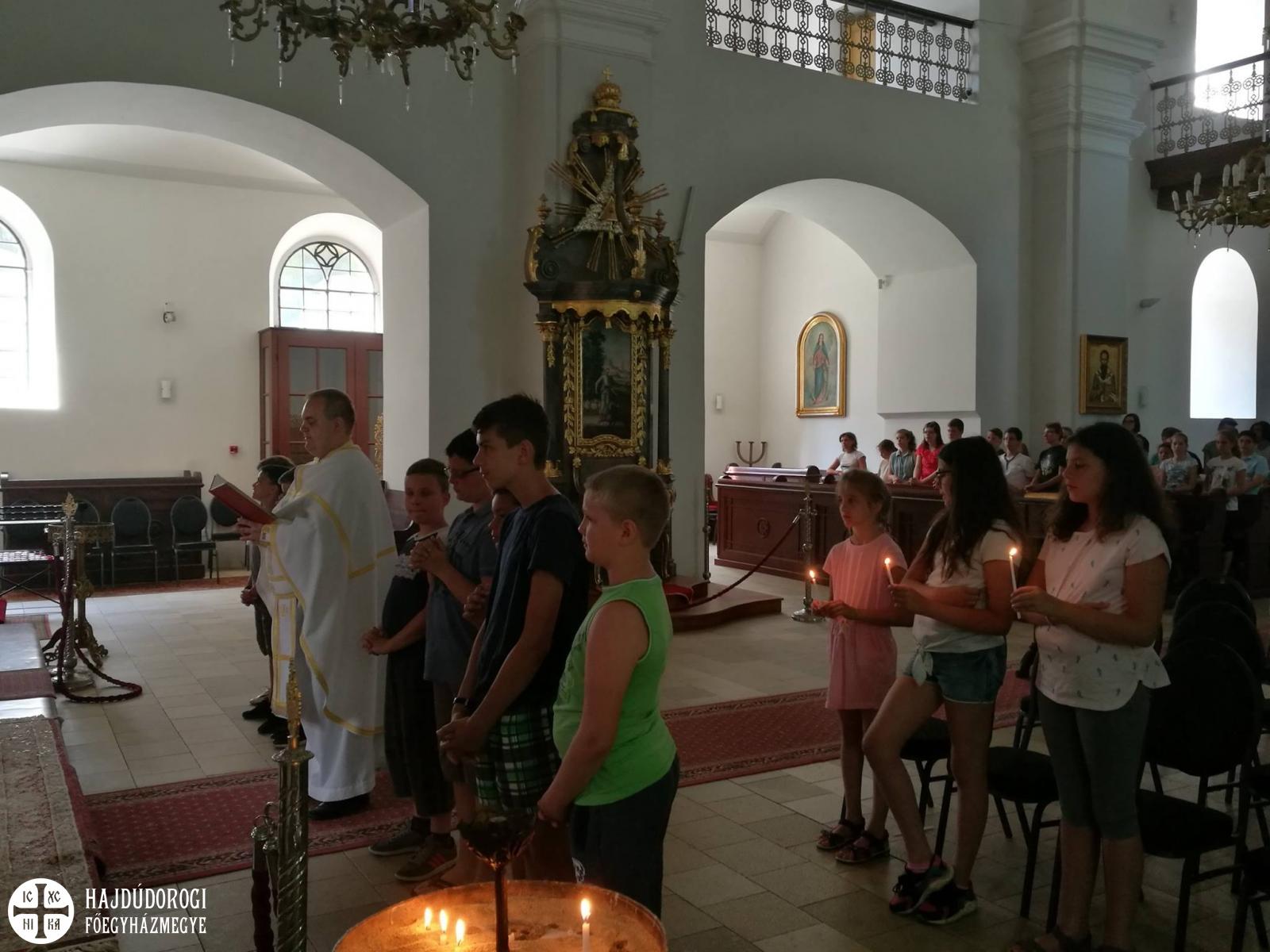 Ezzel a mottóval indultunk útnak ebben az évben a Debreceni Görögkatolikus Parókia gyermekeivel, hogy egy szép hetet eltölthessünk az idei táborunkban, Hajdúdorogon. Otthonunk a Szent Bazil oktatási Központ volt, hiszen a szállásról, az étkezősről és sportolási lehetőségről is itt gondoskodtak számunkra, amiért oly hálásak vagyunk. Első úti célunk Hajdúböszörmény volt, ahol felkerestük a Népi Hajdúházat. Részt vettünk egy tárlatvezetésen és kézműves foglalkozásokon: volt csuhé-fonás, gyöngy-fűzés, nemezelés, fonás, gipszfestés, ráadásul kapunk finom limonádét és kenyérlángost is. Délután érkeztünk meg Hajdúdorogra, ahol elfoglalva szobáinkat tábornyitást tartottunk, így elsétáltunk a Hajdúdorogi Székesegyházba, hogy Istenünk áldását kérjük erre a táborra.