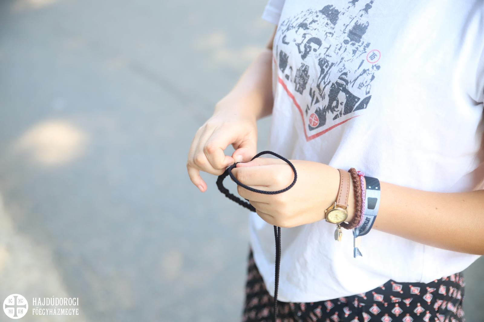 Ilyen imafüzért köt a séta közben Fanni is, de nem magának, hanem barátainak. „Munka közben” értük is imádkozik, és így olyan mintha együtt csinálnák meg. Elég rutinos csotki-kötő. Egy óra alatt meg tud csinálni egyet, de azért utána már nagyon fájnak az ujjai. A fiatal hölgy negyedik alkalommal jött zarándokol. A társaság és a barátok mellett azért jön vissza évről-évre, mert iskolakezdés előtt neki ez egy nagy kihívás és erőt ad a tanévhez, ha végig tud menni a Máriapócsig tartó úton, és kérni tudja a Jóisten segítségét a tanuláshoz.