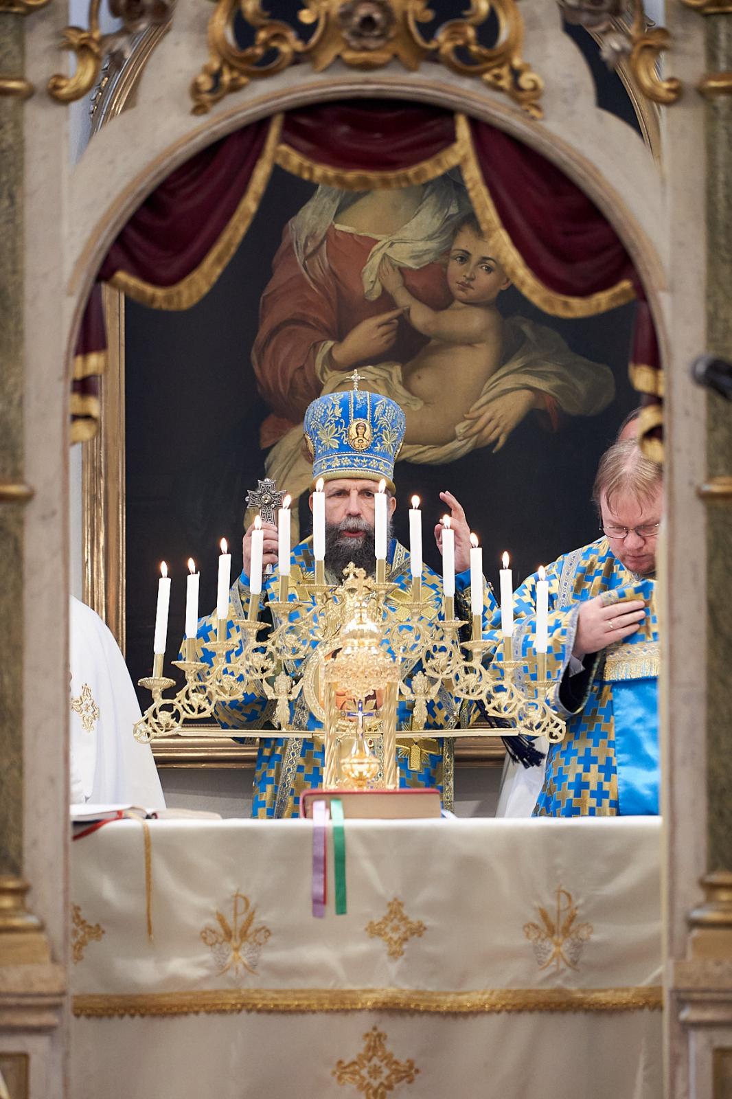 A Szent és Isteni Liturgia énekszolgálati rendjéhez kapcsolódóan, a Szent Efrém Férfikar előadásában a Mennyei király magyar és ószláv nyelven, a Triszágion Athosz-hegyi, görög-ószláv-magyarul, a Kerubének a sajópálfalai irmologionból ószlávul, a Szent, szent, szent... ószlávul, a Téged éneklünk... magyarul, a Mi Atyánk... – szír dallamra, arámi nyelven csendült fel. Ezt követően az énekesek koncerttel is kedveskedtek a jelenlévőknek. Elhangzottak Rachmaninov Bogorodice, Bubnó Lőrinc feldolgozásában az O Măcu?ă Sfântă, Kodály Semmin ne bánkódjál Krisztus szent serege, valamint X. Bölcs Alfonz: Santa Maria amar (Szeressük a Szűzanyát) művei.