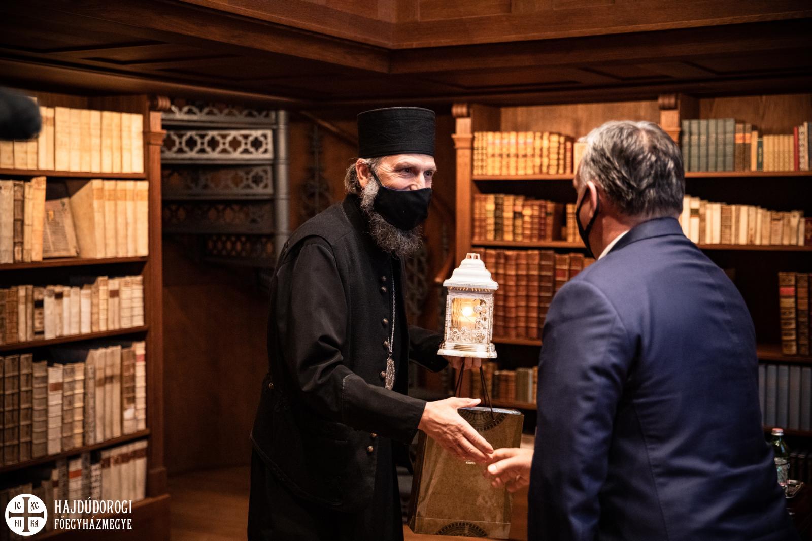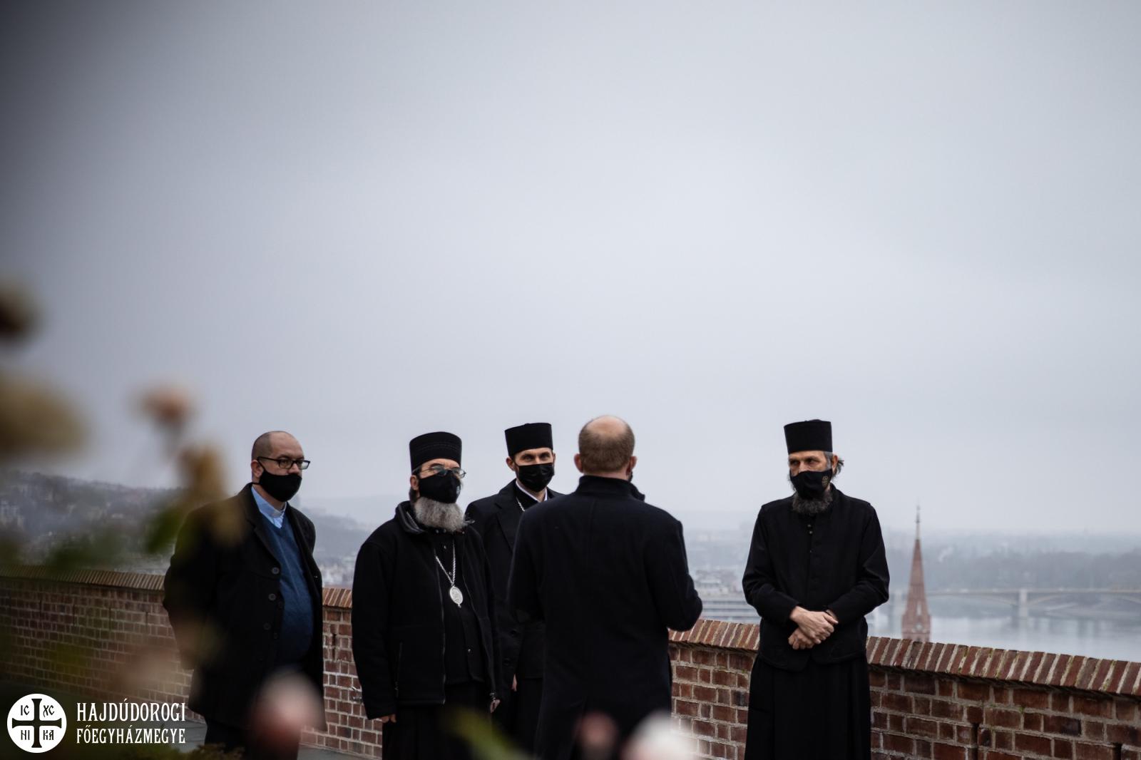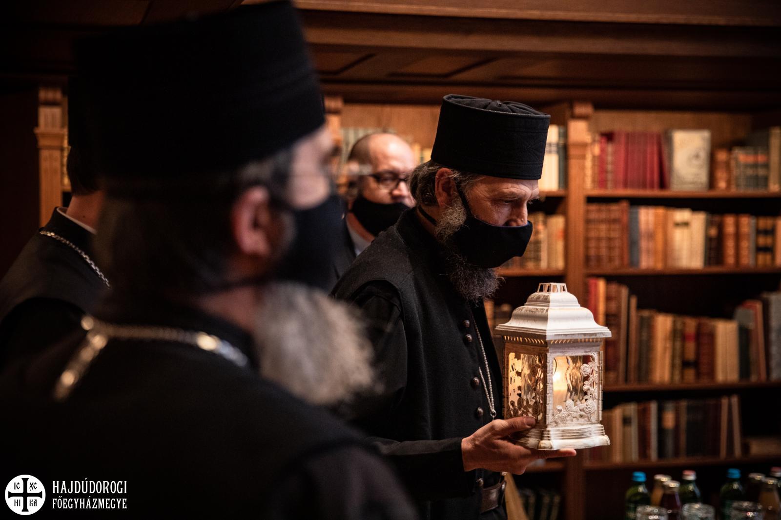 A három püspököt elkísérte Dr. Seszták István is, a metropóliai hivatal vezetője. Elsőként átadták nekik a Debrecenből hozott betlehemi lángot. Majd egy szépen zengő kántáló ének mellett a karácsony ünnepének ikonját és a metropólia néhány ünnepi kiadványát.