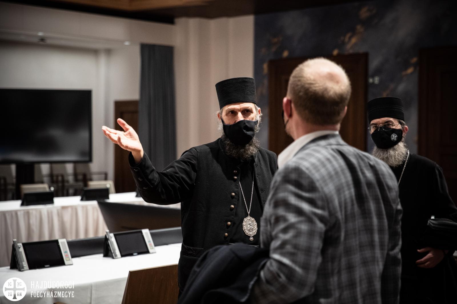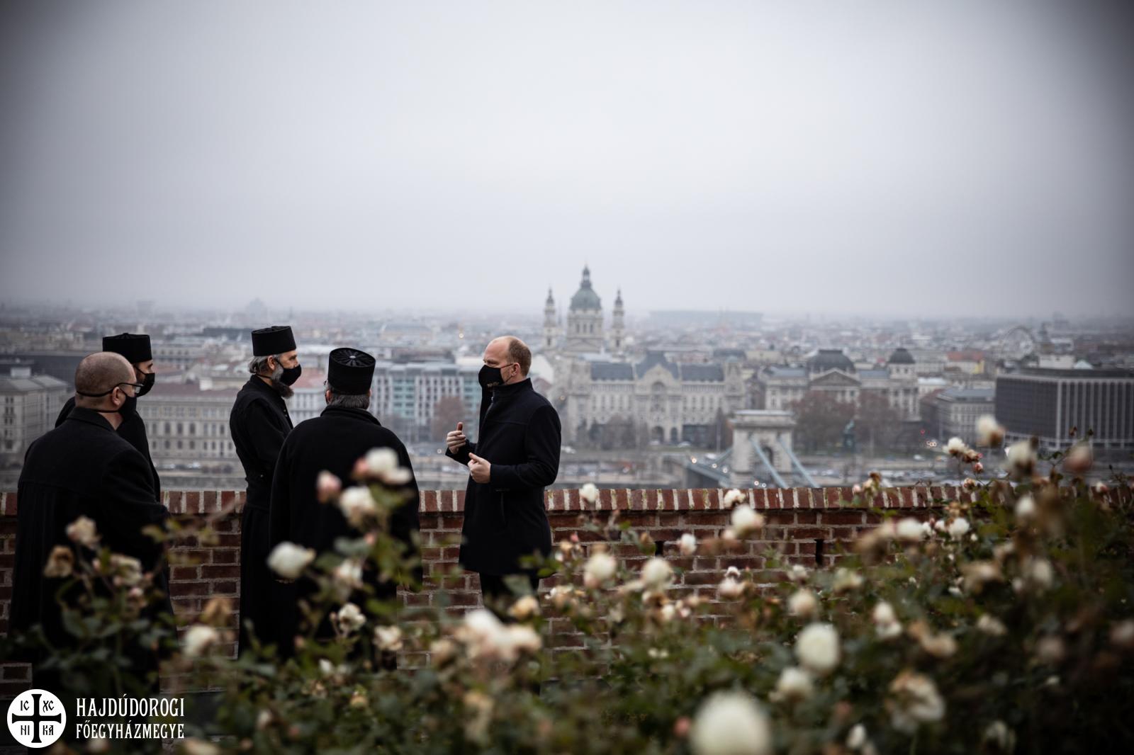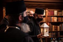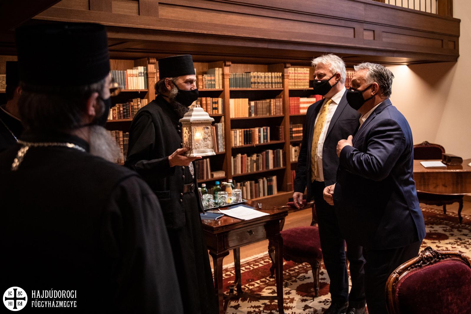 A három püspököt elkísérte Dr. Seszták István is, a metropóliai hivatal vezetője. Elsőként átadták nekik a Debrecenből hozott betlehemi lángot. Majd egy szépen zengő kántáló ének mellett a karácsony ünnepének ikonját és a metropólia néhány ünnepi kiadványát.