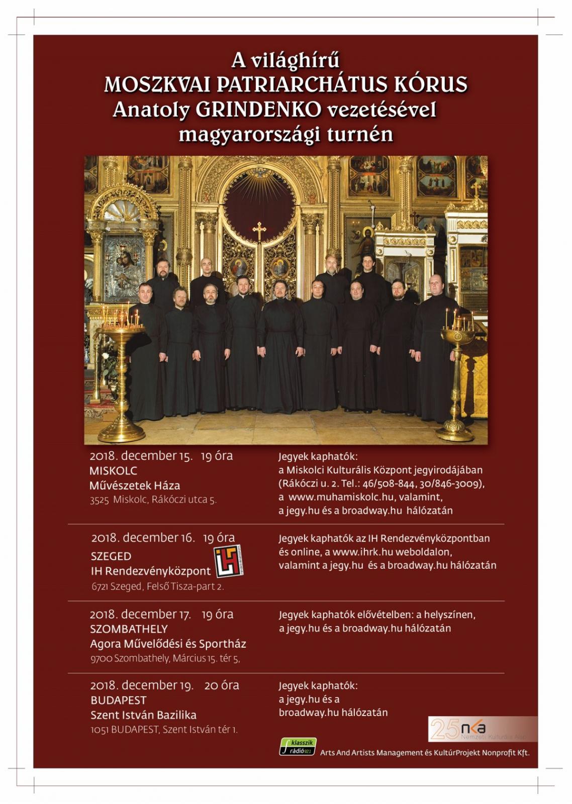 A Moszkvai Patriarchátus Kórusa Anatoly Grindenko mester vezetésével az ószláv egyházi zene világszerte elismert, legautentikusabb előadója. Állandó vendégei a nagy nyugati zenei fesztiváloknak, koncerttermeknek, még a New-York-i Lincoln Centerben is felléptek óriási sikerrel. Hazánkban is többször jártak már és mindannyiszor óriási sikert arattak.