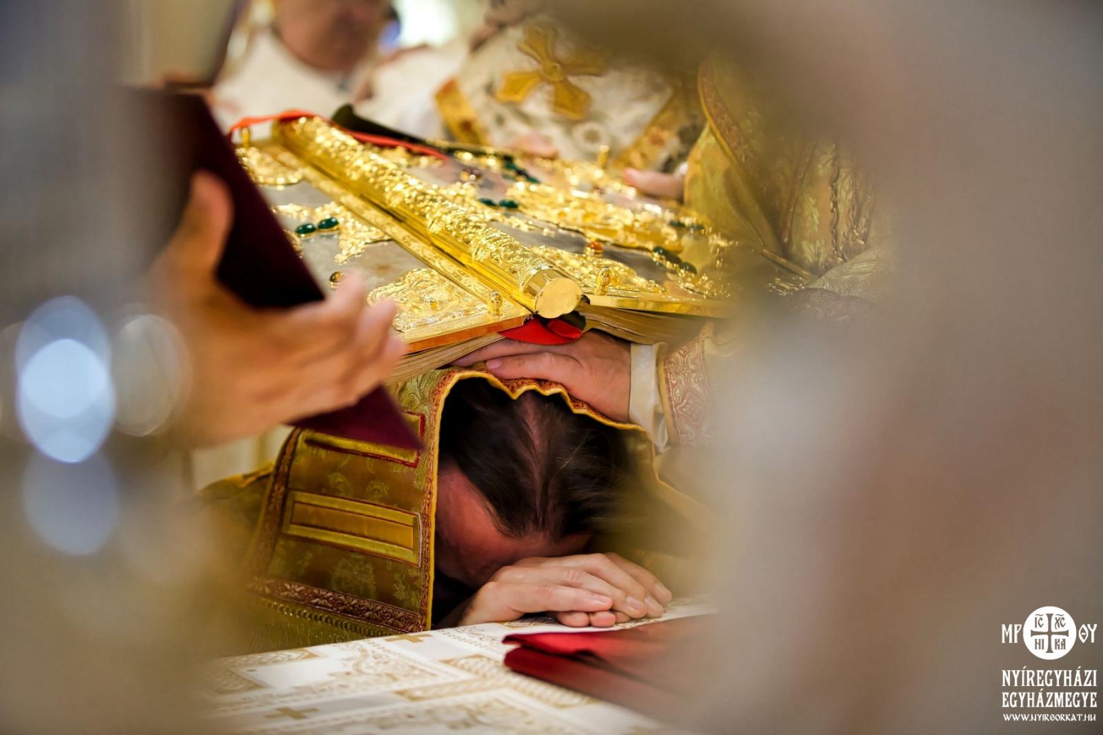 Majd letérdelt előtte, ráhajtotta élére homlokát. Omofort terítettek fejére, melyre a három szentelő püspök: Kocsis Fülöp metropolita, Orosz Atanáz miskolci megyéspüspök és Cyril Vaszil’ érsek, a Keleti Egyházak Kongregációjának titkára egyszerre helyezte egyik kezét. Másik kezükkel a szentelendő feje fölé evangéliumos könyvet tartottak, s így mondták el a szentelési imát. A többi püspök atyák az apostoli folytonosság jeleként egymás vállára helyezték jobb kezüket egészen az oltárig, a szentelendőig.