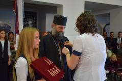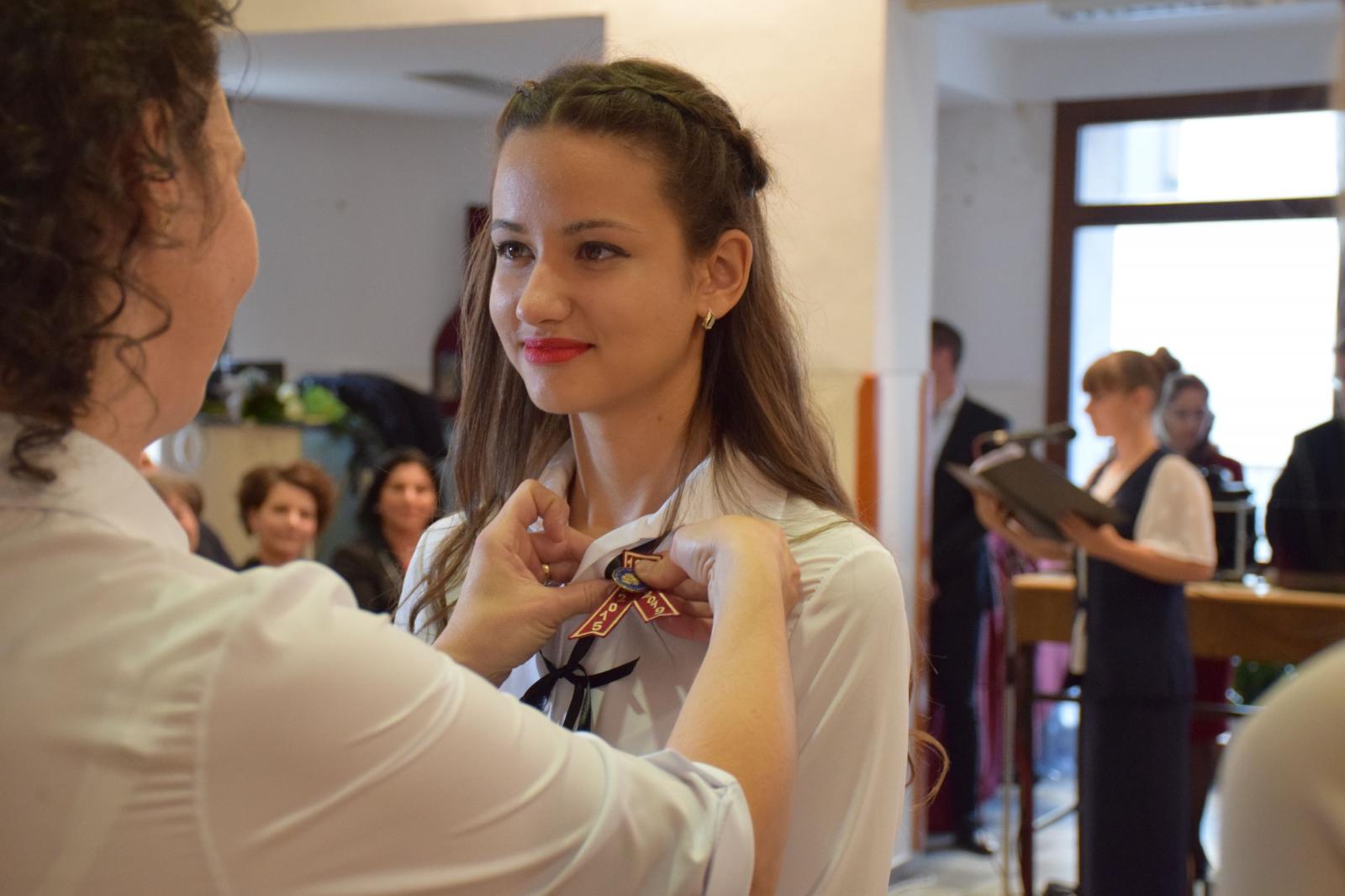 Ezt követően a régi hagyományoknak megfelelően, érsek-metropolita atya megáldotta a végzősök szalagjait, melyet az osztályfőnökök, Nyalka Anita, Kissné Oláh Edit és Major Olivér tűztek fel diákjaik számára, akik a hála virágaival köszönték meg szüleiknek, hogy segítségükkel e szép ünnep részesei lehetnek.
