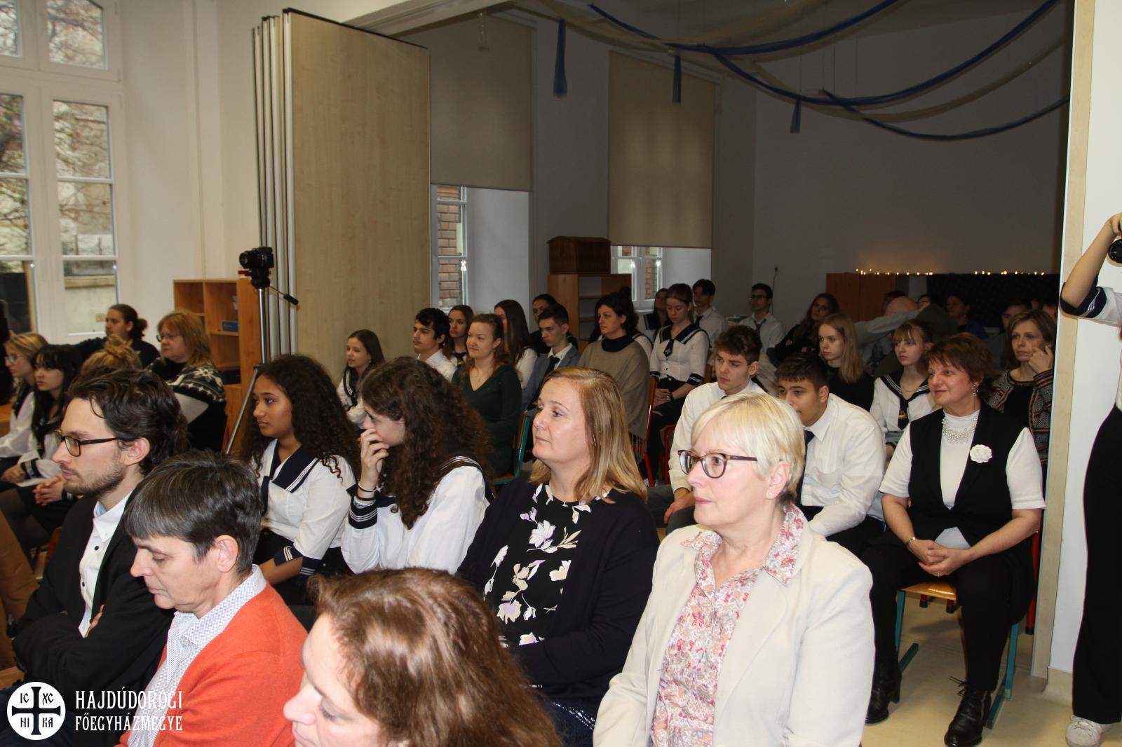 Az ünnepséget énekével beragyogta az iskola évről-évre szebben szóló kórusa, Tóth András görögkatolikus színművész pedig Weöres Sándor Harmadik szimfónia című versét adta elő. Az egyéni és csoportos fellépők mind-mind megcsillogtattak valamit abból a tökéletességből, amiről Sándor atya beszélt.
