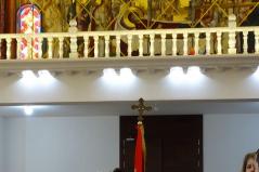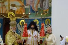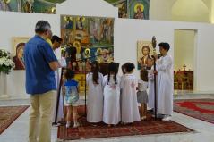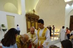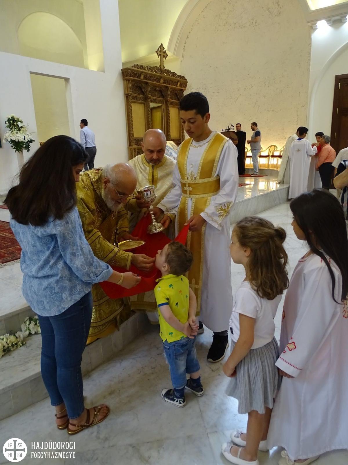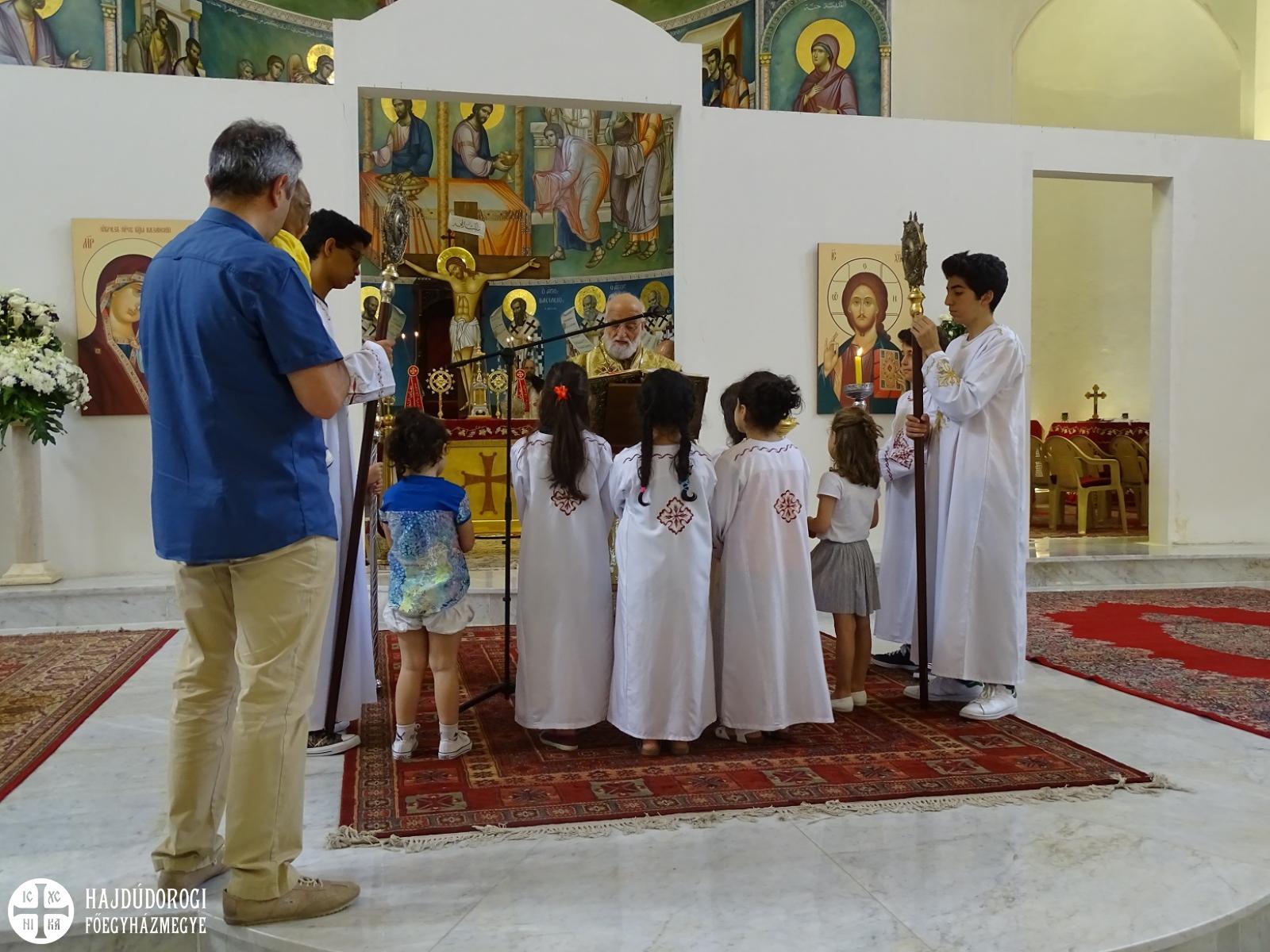 A pátriárka kint ült a királyi ajtó előtt, s mikor meglátta Fülöp atyát, neki is odahozatott maga mellé egy széket. Meghívta koncelebrálásra is, így együtt végezték még másik három pappal együtt a Szent Liturgiát. A celebrációban gyönyörű elemeket láthattunk. Közel húsz ministráns fiú és leány állt készen a szolgálatra szép fehér ruhába öltözve. Mindannyian részt vettek a kis és nagy bemenetben, kereszttel, ripidionnal, zászlókkal, mécsesekkel a kezükben. Látszott, hogy nem mindnyájan rutinosak a mozgásban, de a nagyobbacskák segédkeztek a kicsiknek, hogy el ne tévedjenek a nagy vonulásban. Ugyanis az egész templomot körbejárták vele, mindkét alkalommal. Kedves jelenet volt még, hogy az Evangélium olvasása közben nem csak ezek a fehér ruhás ministránsok állták körbe az olvasóállványt, de gyakorlatilag az összes templomban lévő gyermek odasereglett, és tátott szájjal hallgatták, amint a pátriárka – korát meghazudtoló – erőteljes hanggal énekelte az Evangéliumot.
