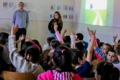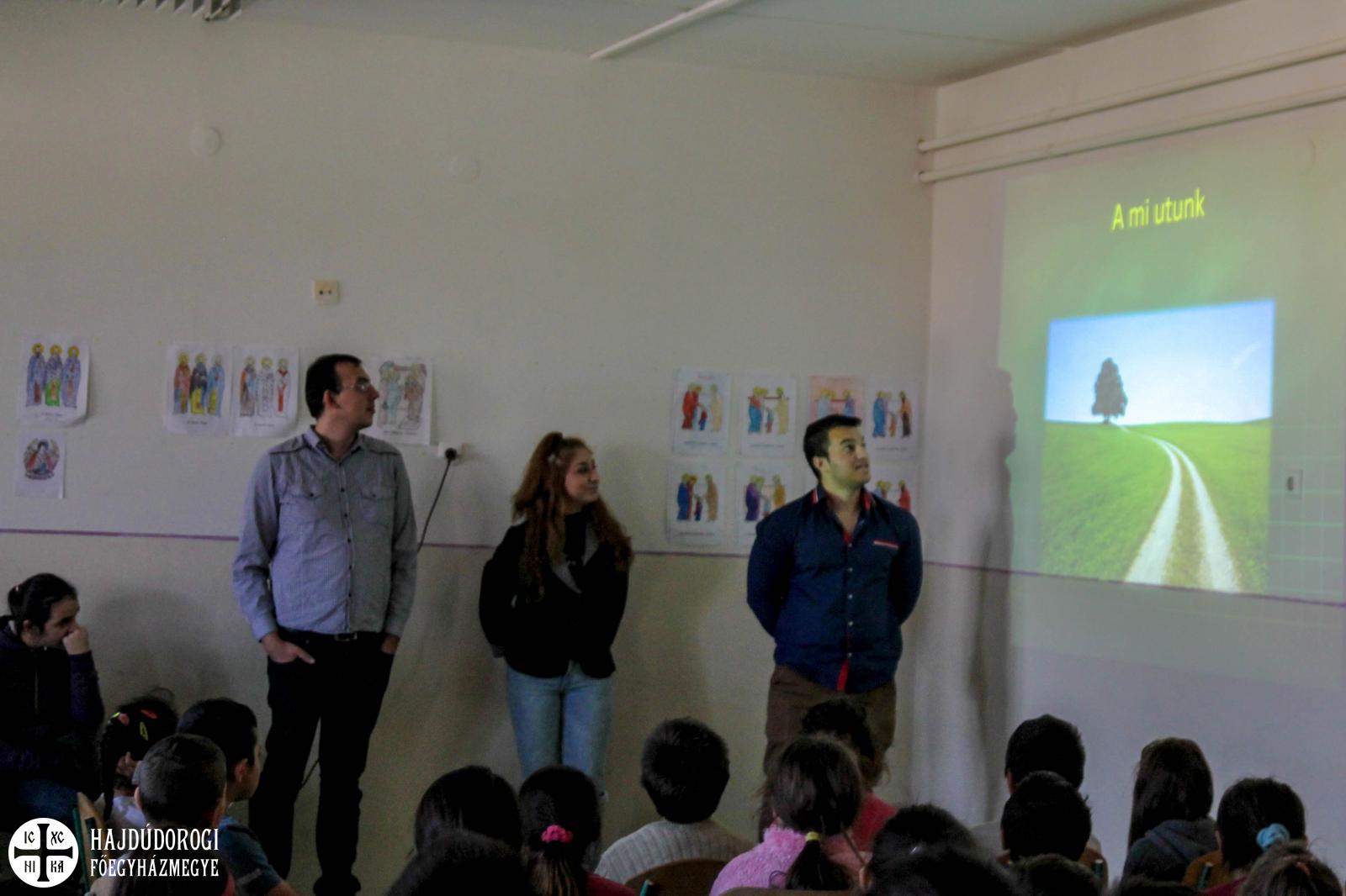 Látogatásunk azonban nem csak ajándékozásról szólt; három szakkollégistánk (Makula Szandra, Molnár Zoltán és Kóti Tibor) tanulási motivációs előadást tartott a diákoknak. Az interaktív előadás során körülbelül száz gyermekben igyekeztünk gondolatokat ébreszteni a tanulás fontosságával kapcsolatban, az üzenetet a szakkollégisták életútjuk bemutatásával tették hitelessé.