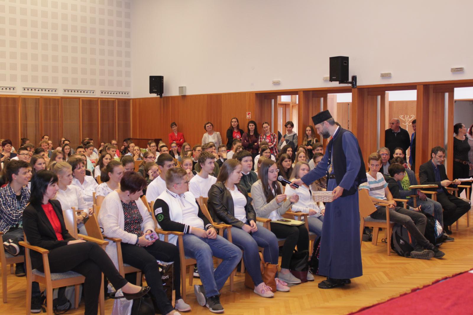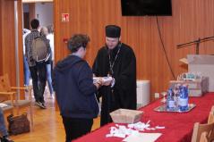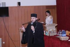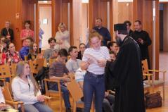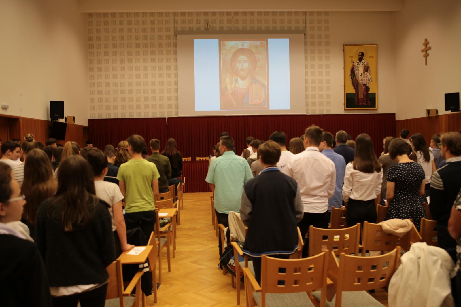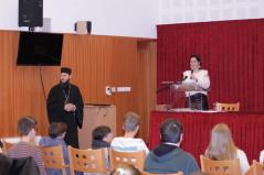 A döntő feladatlapjának megírása utána Dr. Papp Miklós tanszékvezető főiskolai tanár előadása következett az Isten adományaként kapott tehetségről. A Fülöp érsek-metropolita atya által vezetett imaóra után jött az ebéd, majd a fórum, ahol a diákok kérdéseire válaszolt a metropolita atya.
