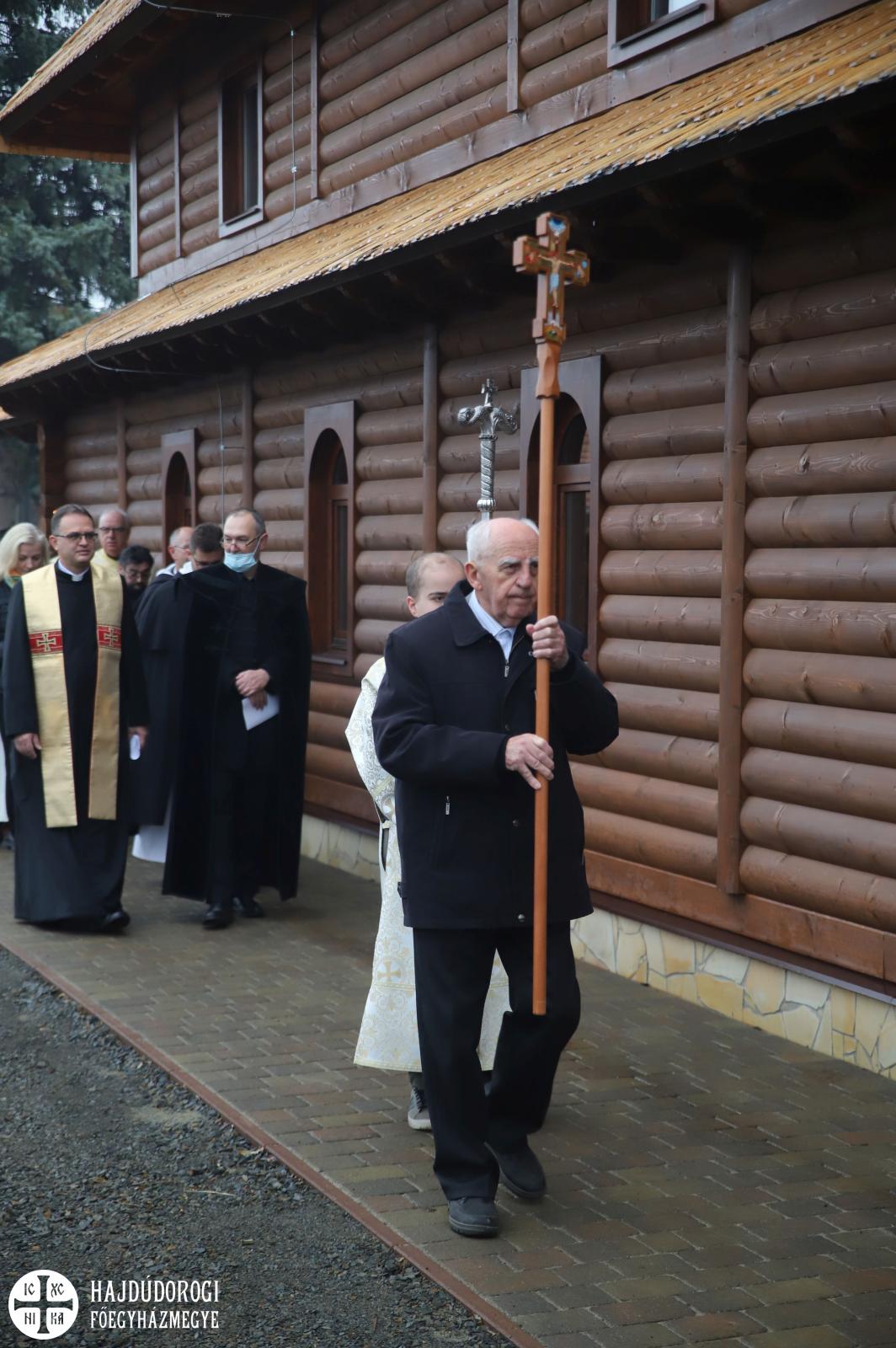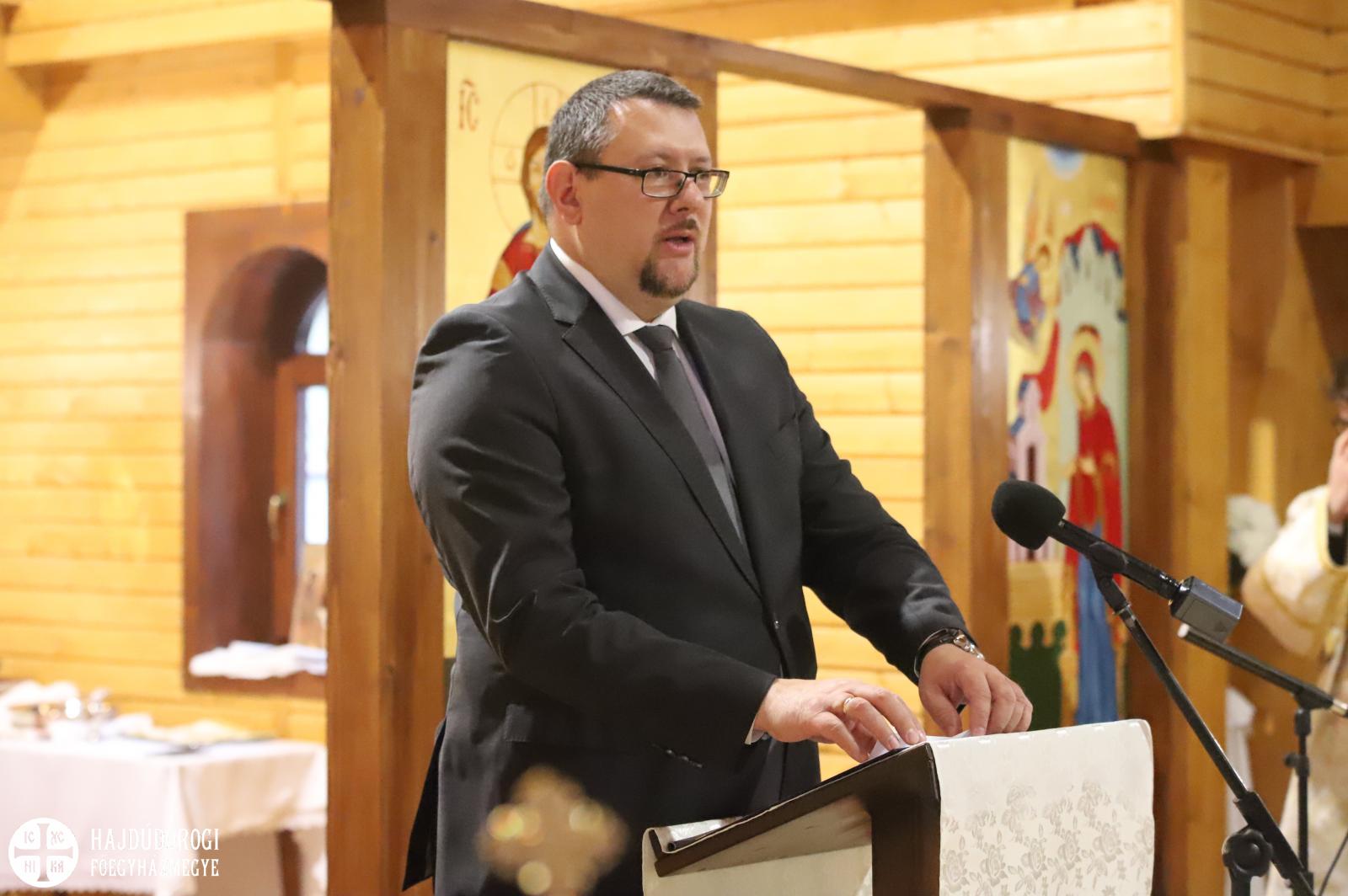Majd arról szólt, hogy nem kevés küzdelem övezte a megvalósulás folyamatát is, hiszen sokak idegenkedtek a stílusától vagyis attól, hogy fából készült. Ebben a ruszin kisebbség volt a görögkatolikus segítségére. Kisebbségben élnek Debrecenbe, akárcsak a görögkatolikusok. De összefogás eredményeként előbb közösségi ház valósult meg, s ehhez már könnyebben lehetett illeszteni a ruszin kultúrát idéző templomot. Pedig ősi magyar építkezési mód a fatemplom, elég csak a máriapócsi vagy a szentendrei skanzenben látható görögkatolikus fatemplomra gondolni, amit Mándokról szállítottak oda.