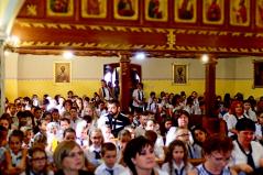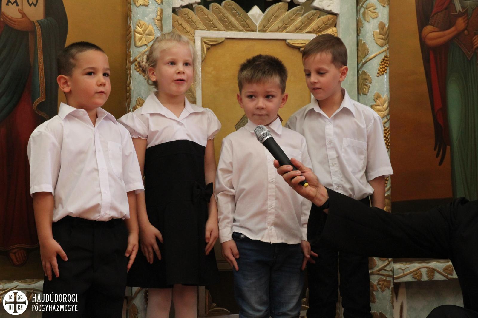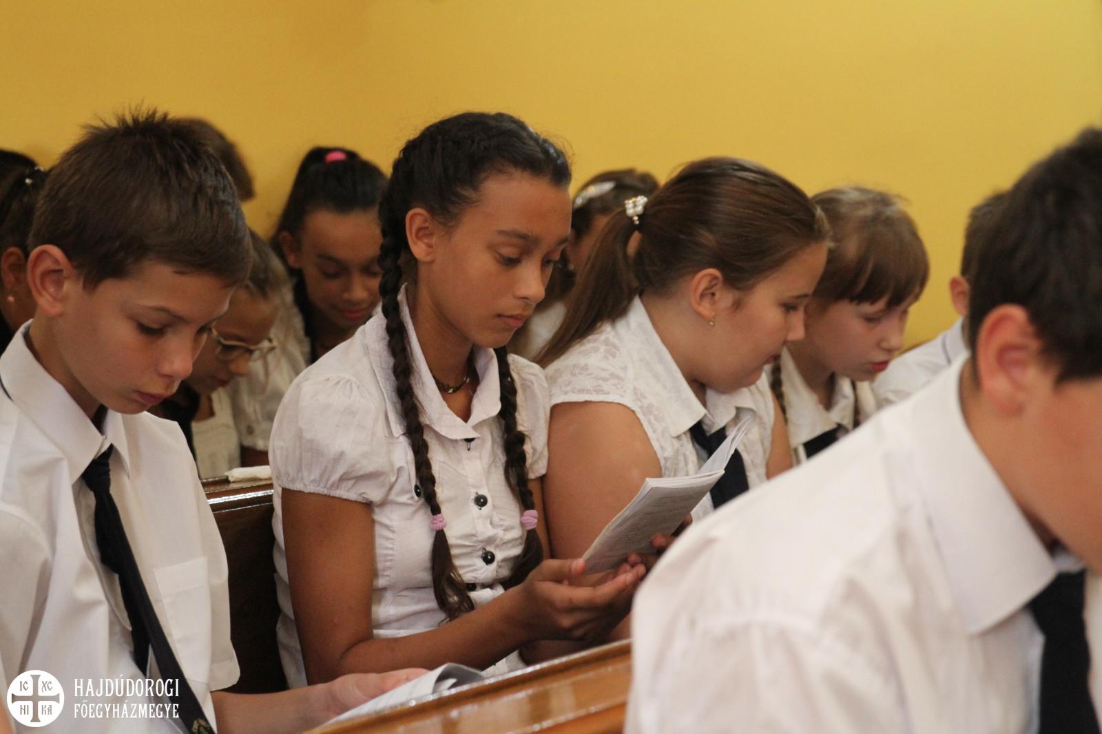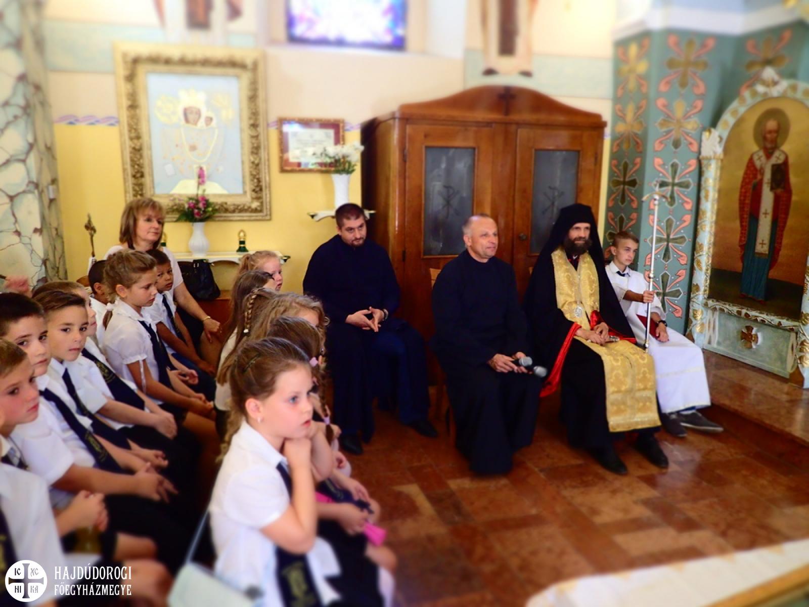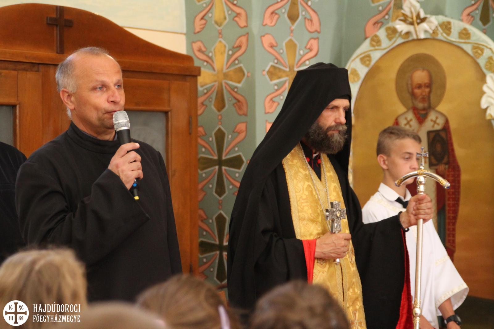 „Az igazán lényeges dolgokat a szívünkkel látjuk” - mondta Kocsis Fülöp metropolita. „Fontos tehát, hogy mi felé fordítjuk a szívünket. Ha leginkább a világi dolgokkal, mondjuk a fiúk versenyautókkal vagy éppen a lányok szépészeti dolgokkal foglalkoznak sokat, akkor nem sok széppel és jóval telítődik a szíve. A jó Isten azonban megtanít Titeket a szívetekkel látni. Az idei esztendőben azért imádkozunk, hogy minél nagyobb szívű emberekké váljatok! Hogy miért? Hogy boldogok legyetek, hogy észrevegyétek a másik embert, hogy érzékenyen tudjatok oda fordulni a másik emberhez. Ehhez kell a nagy szív. Ahogyan a Bibliában olvashatjuk: „ahol a kincsed, ott a szíved.” Ebben az esztendőben az iskola ezt választotta jelmondatává. Vagyis amiket fontosnak tartasz, oda fordítod a szíved és azzal telítődik. A pedagógusok ebben lesznek majd segítségetekre: irányítgatják a szíveteket, hogy merre forduljatok, mi legyen a Ti kincsetek? Erre lesz egy esztendőtök! Én biztos vagyok benne, hogy a szívetek is növekedni fog ez alatt az egy év alatt. Ezért imádkozzunk!”