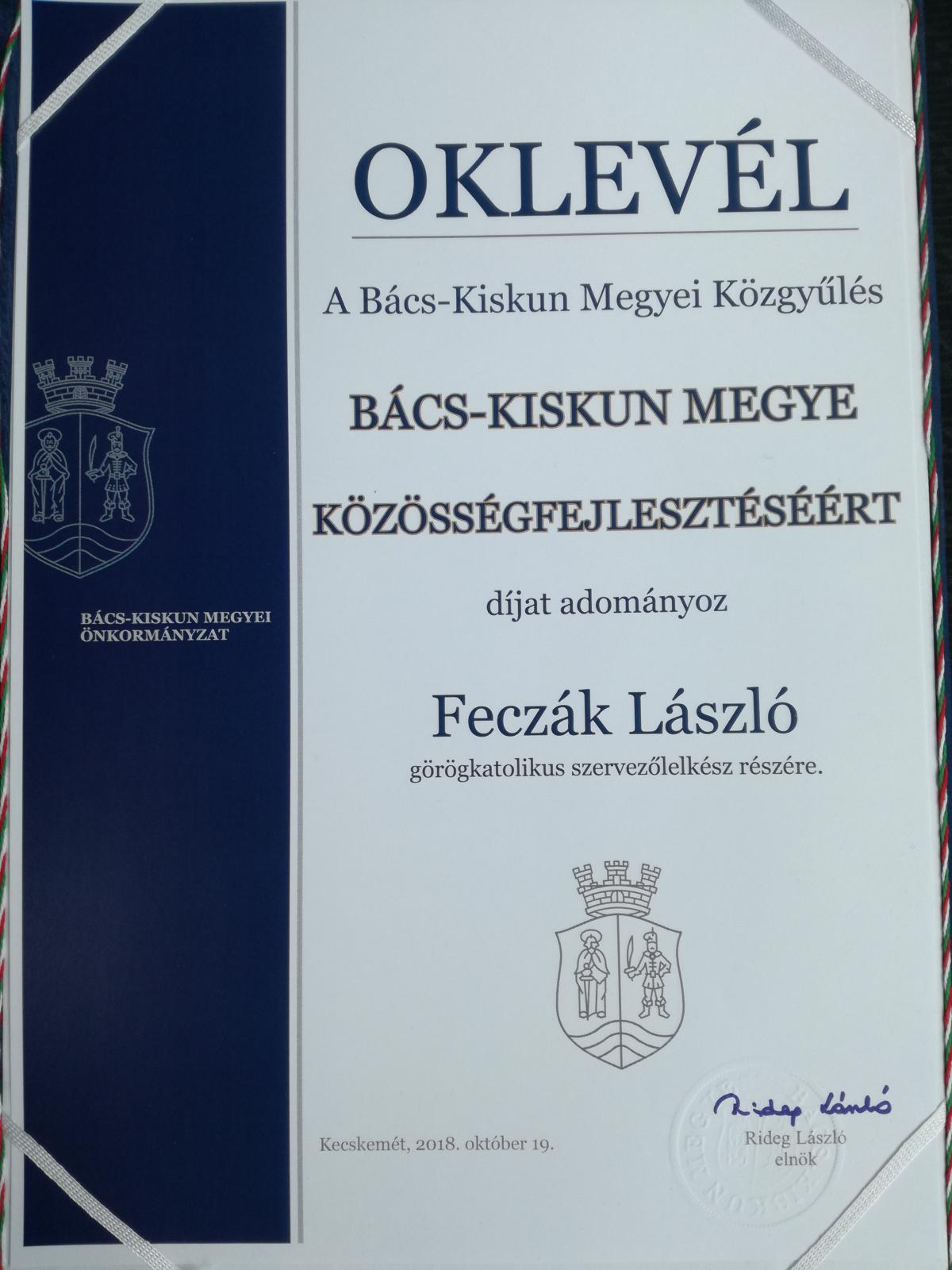 A beszédeket követően adták át az elismeréseket. Feczák László atya Bács-Kiskun Megye Közösségfejlesztéséért díjban részesült. Ennek kapcsán kérdezte a szervezőlelkészt a Kecskemét Televízió is.