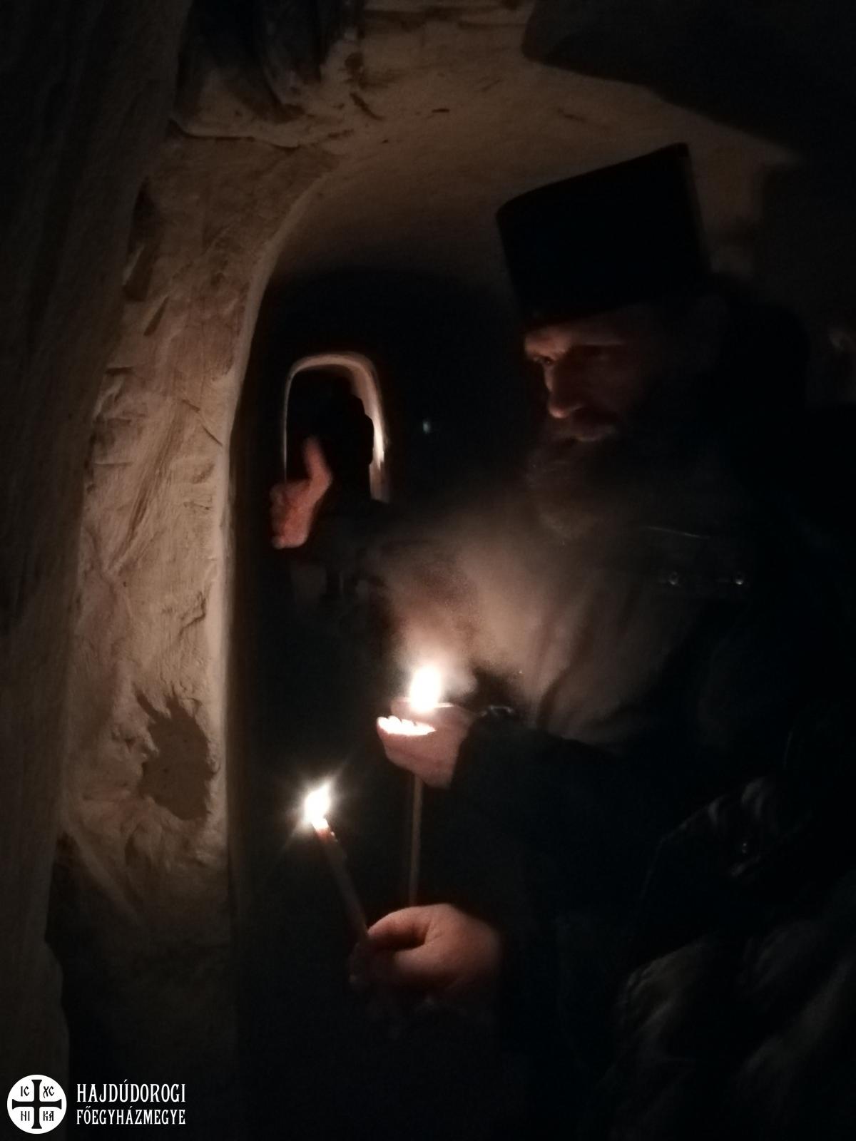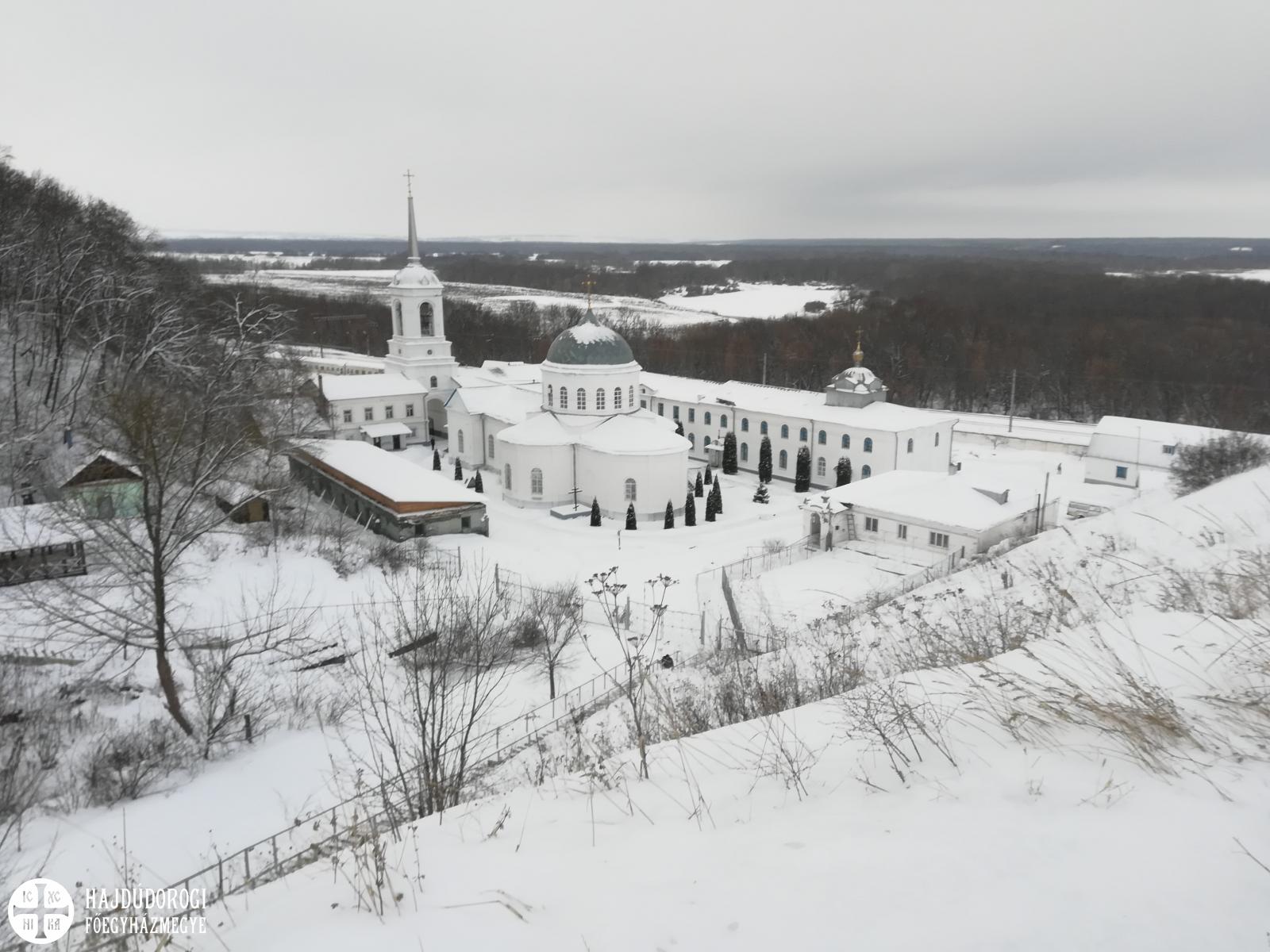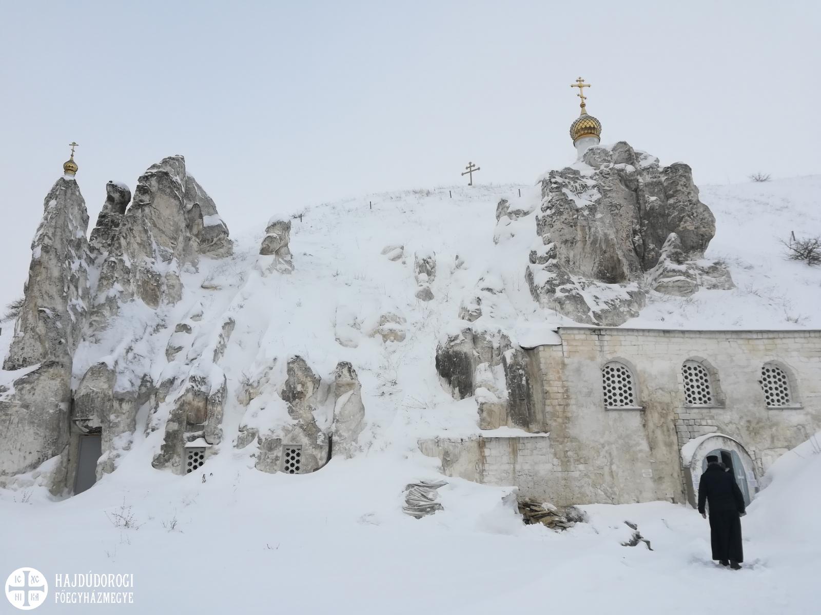 Gyalog kellett leereszkedni a hatalmas hóban a mély völgybe, amelynek alján megbújt a monostor. Szépen felújított templomában a karácsony ünnepkörében lévén annak ünnepi tropárját énekeltük el, majd Alekszij atyát, az igument kerestük, aki elvileg már várt minket. Sajnos azonban az időjárási viszonyok miatt még nem érkezett vissza a monostorba, ezért egy fiatal szerzetesnővér mutatta meg a monostor fölött magasodó sziklába vájt templomot és ahhoz tartozó folyosórendszert. A szűk alagutak remetecellákat és kápolnákat kötöttek össze. A nővér ekkor tudta meg, hogy görögkatolikusok vagyunk. Kis híján kiesett a kezéből a világítás gyanánt használt gyertya, és zavarában angolul kezdett motyogni. „Mindig angolul beszélek, ha sokkot kapok” – mondta. Elbúcsúzáskor már nem is kért áldást a görögkatolikus metropolitától – mint tette a találkozás pillanatában.