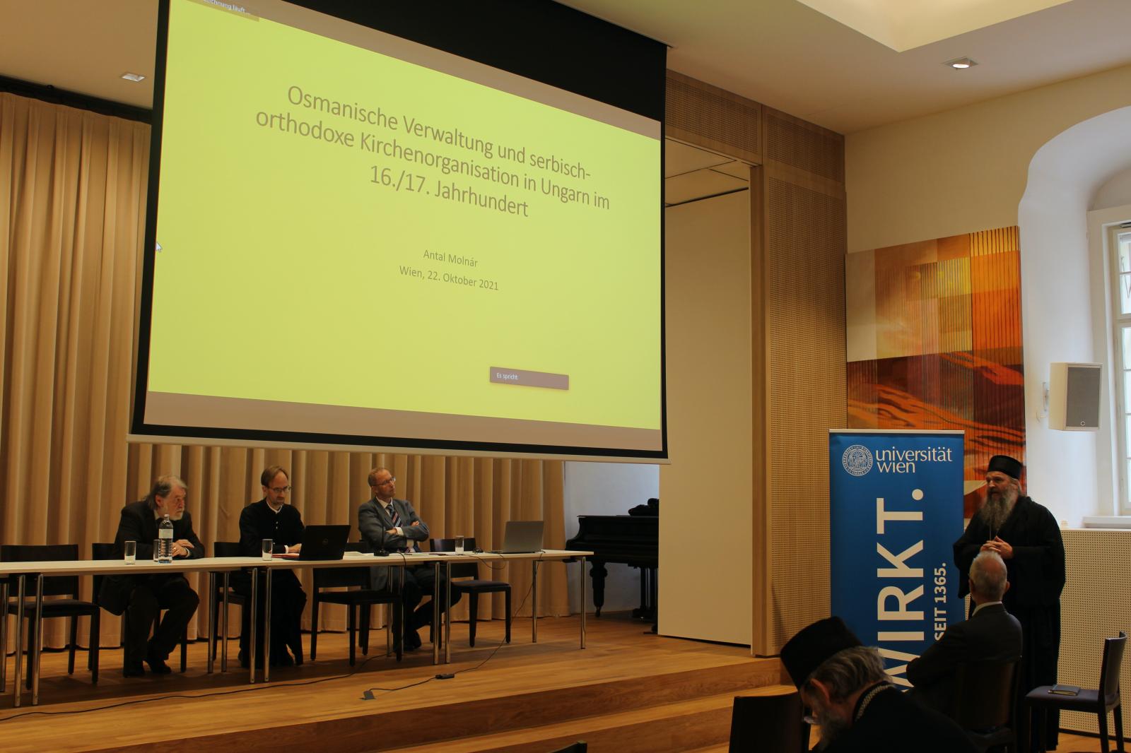 A tanácskozás első napján, melynek középpontjában az egyháztörténet állt, Baán István a magyar királyság területén lévő ortodox egyházak középkori fejlődését vázolta fel, míg Molnár Antal a török közigazgatás és a szerb-ortodox egyházszervezet 16-17. századi kapcsolatát ismertette.