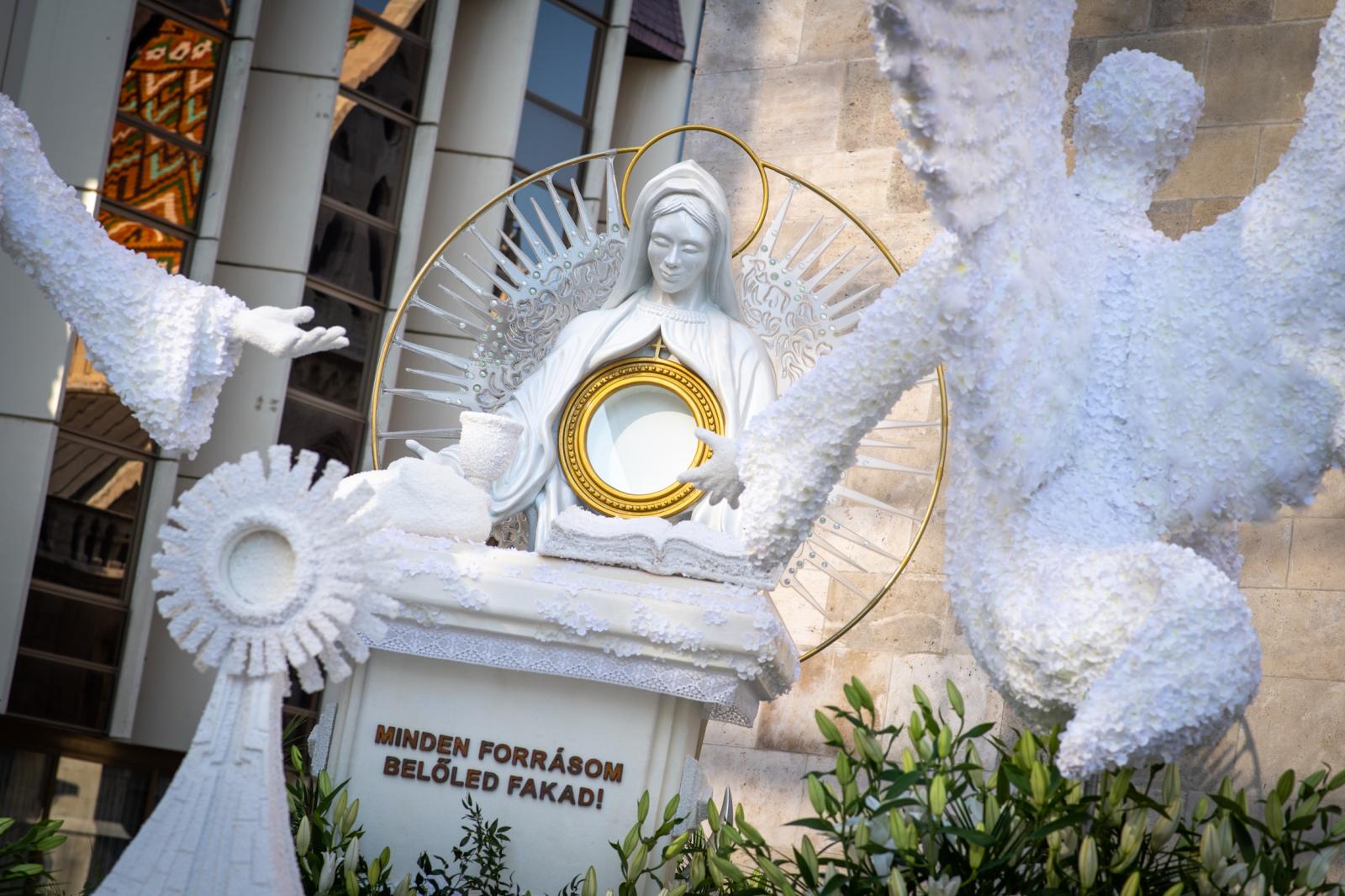 Az Eucharisztia tulajdonképpen Jézus valóságos Teste és valóságos Vére a kenyér és a bor színe alatt, az évek során számos csoda kötődik az Eucharisztiához, az egyik legismertebb a magyarországi Bátán történt, amikor egy átváltoztatott ostya vérezni kezdett. Ezen a virágkompozíción ez próbál megelevenedni: fontos az, hogy egy világméretű találkozót a Szent István által Mária oltalmába ajánlott országban rendeznek meg. Mária életének pedig a középpontjában az Isten volt, ezt szimbolizálja az Eucharisztia, amelynek piros színe a bátai csodára emlékeztet. (Tervező és szobrász: Pikó Sándor és Nádasdi Róbert, virágdizájn: Szabó Erzsébet, statikus: Kiss Péter)
