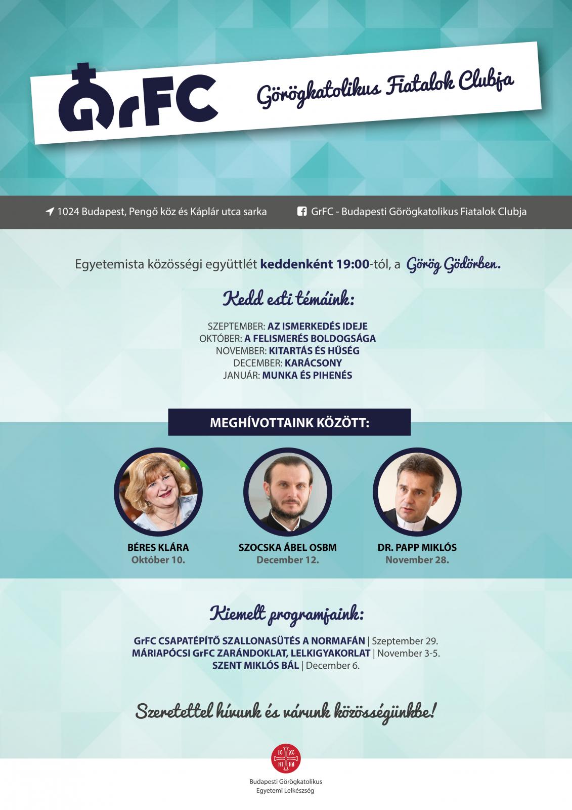 Hiánypótló ifjúsági találkozási pont. Egy hely, ahol a Budapesten és környékén tanuló görögkatolikus egyetemisták, főiskolások és korosztályuk hetente találkozhat. Egy olyan közösség, amelyben szó esik hitről, értékrendről, szerelemről, örömről és bánatról, ahol van imádság és tudomány, ahol van egyetemista élet, ahol vannak előadások, fórumok, kirándulások, játék és buli, ahol van zsíros kenyér. Tehát minden, ami kell. Az idei programok részletei a plakáton olvashatók.
