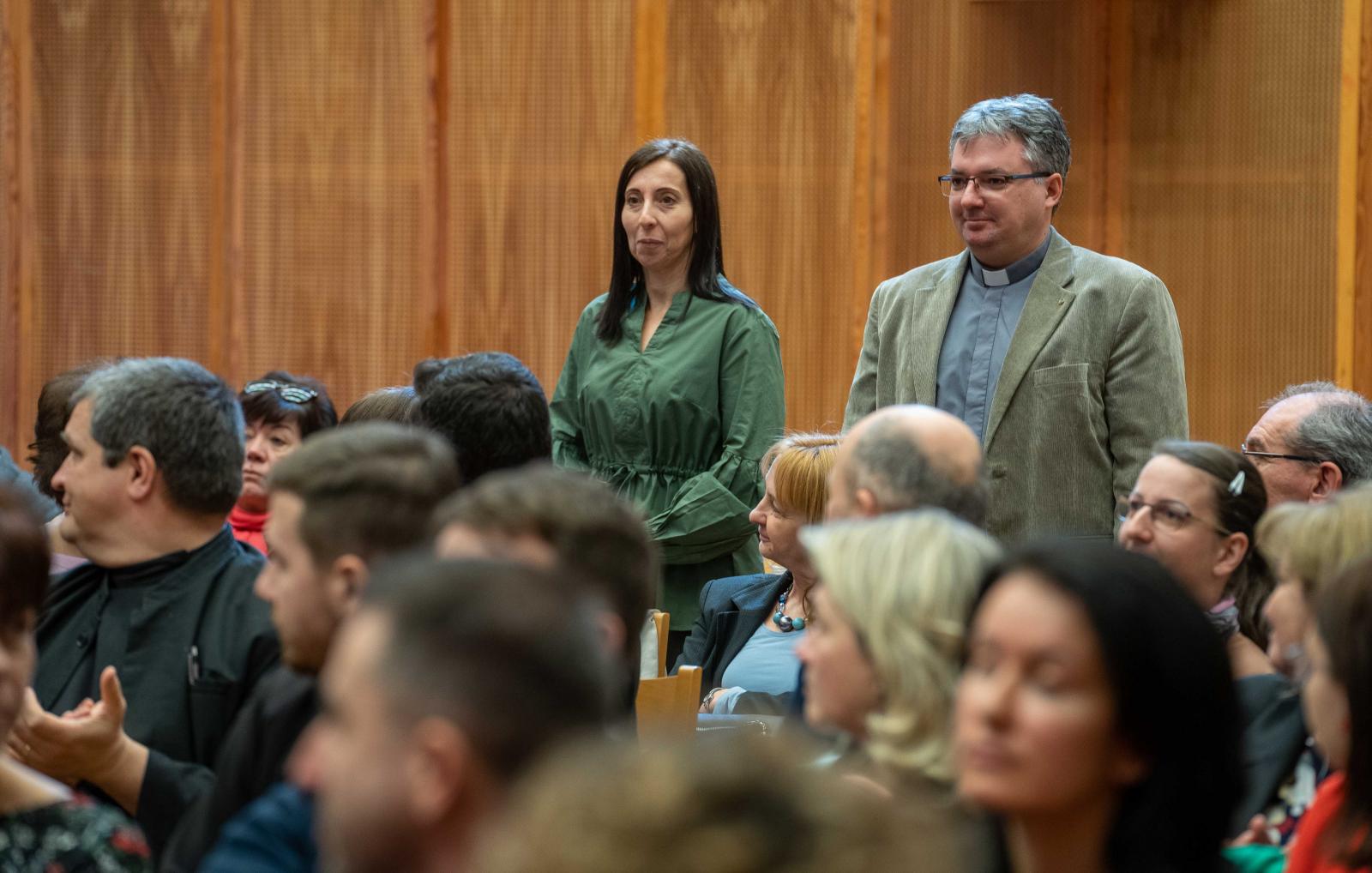 Juhász Géza főhelynök atya, a MEKIF lelki igazgatójaként szólalt fel, s a köznevelési intézmények lelki vezetőinek legfőbb feladataként a személyes jelenlétet nevezte meg: megszólítani és megszólíthatónak lenni a gyermekek számára. Az egyházmegyében tervben lévő „nagyatya-program” elképzelését is felvázolta, mely – mivel a nagyszülő a legtöbb családból hiányzik – a nyugdíjas paptestvérek iskolai jelenlétére építene.